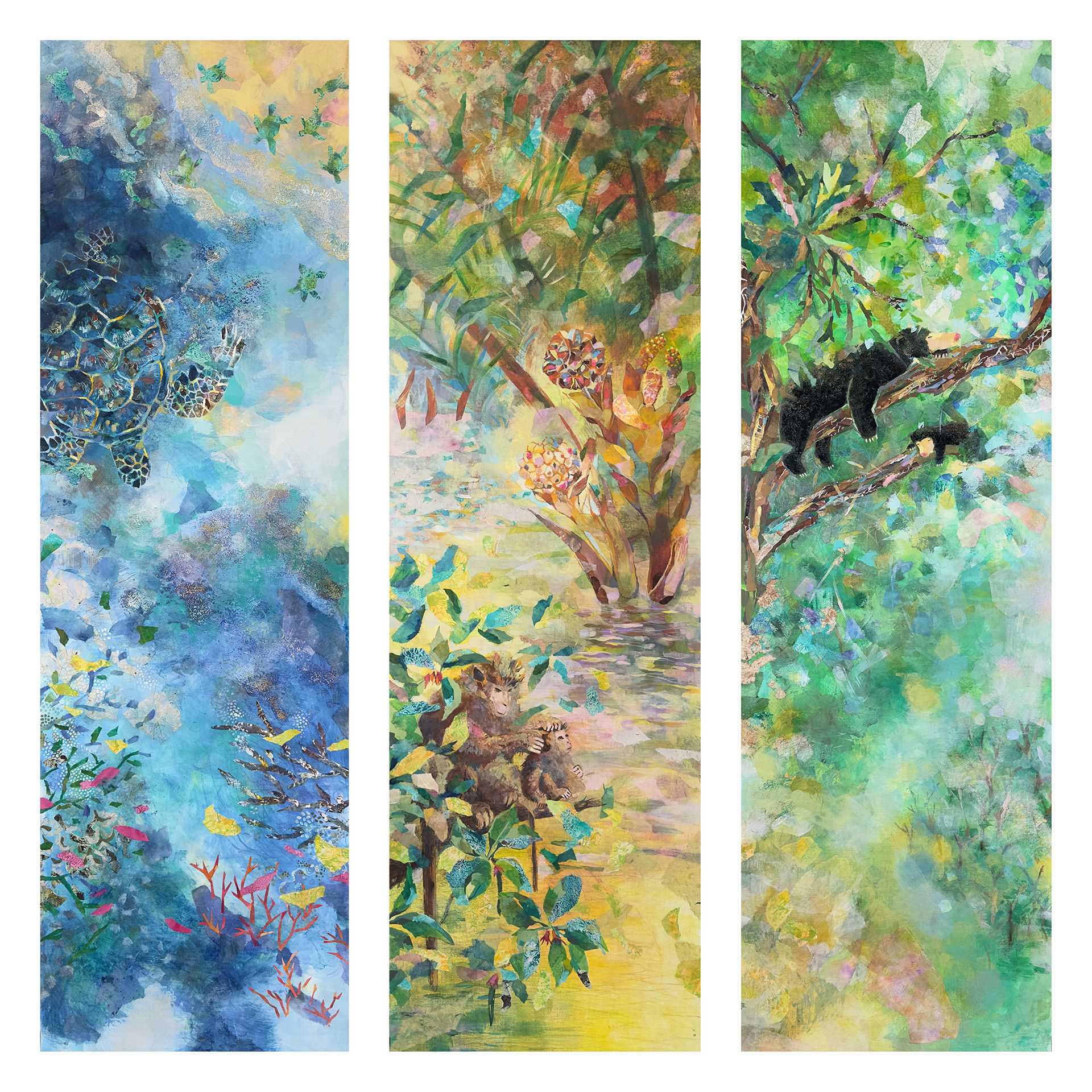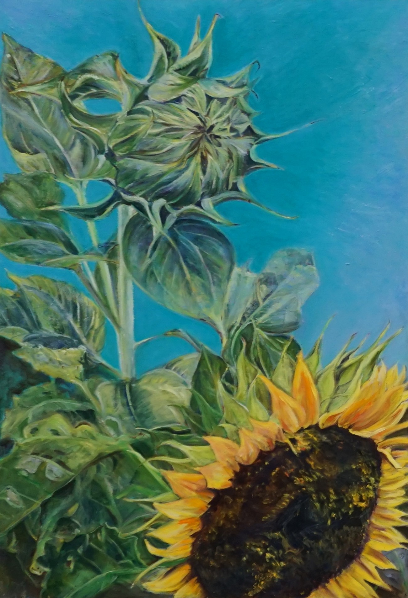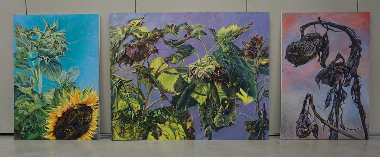季節の移ろいの中で、向日葵が命を輝かせる姿を描こうとした。左図は蕾をつけ大輪の花を咲かせている。中央図は風雨に叩かれ、倒れそうになりながらも、毅然として立つ姿である。右図は葉や茎も朽ちたが、花弁には種子を持ち、命を次に繋いでいこうとする姿である。向日葵の生々流転の流れであり、繰り返す命への讃美である。