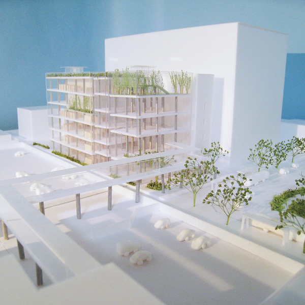 名古屋一の商業地域で目指す日常。7:15働くママと子:レストランで朝食→子はビオトープで遊び、母は横で朝ヨガ→子は隣の託児所へ、母は隣のオフィスに出勤。12:00サラリーマン:ランチ→ボルダリングで一汗→裸足の丘で昼寝。15:30小学生:父のオフィスに帰宅→2階で科学の実験。18:00仕事帰りOL:ヨガ→読書→友人と夕食→アートギャラリーで個展鑑賞。