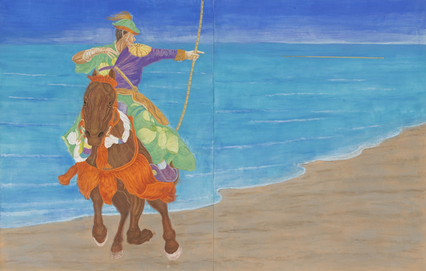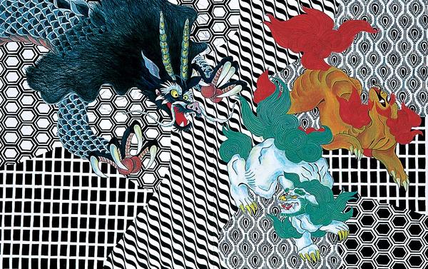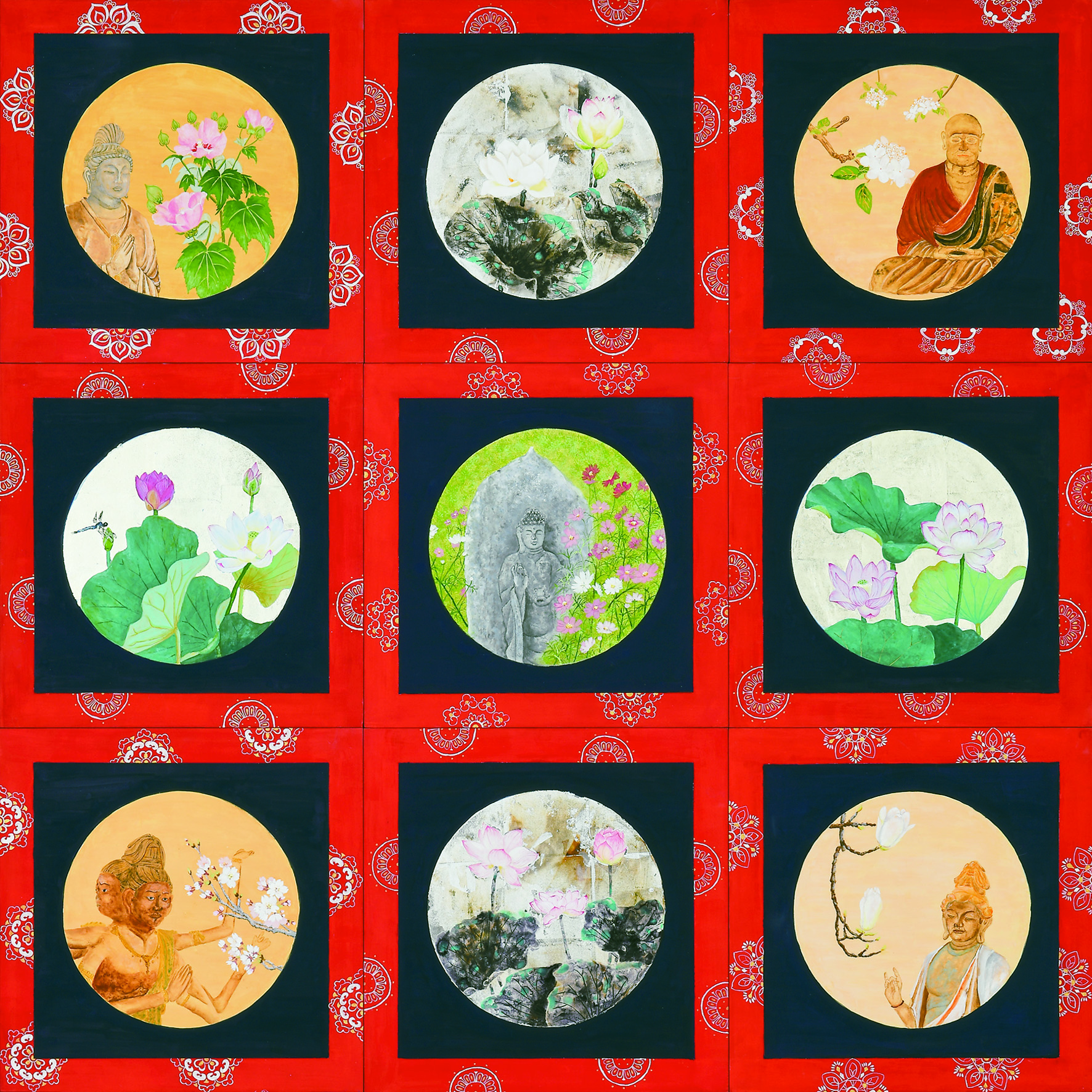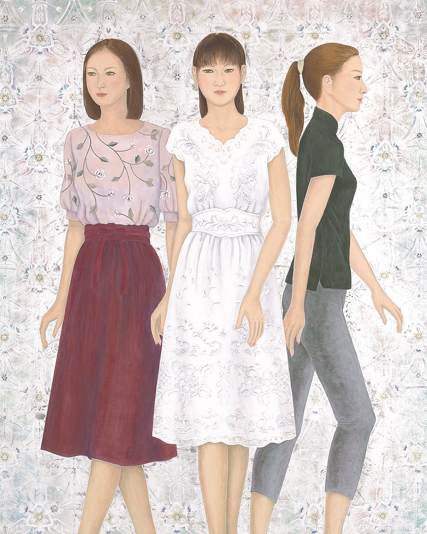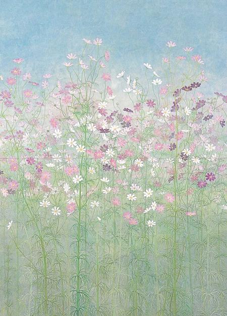 広島の植物園に植えられているバオバブの樹です。推定樹齢400年。3年前にオーストラリアから運ばれ移植されました。異国の地で力強く枝を伸ばして元気な姿を描きました。幹は400才の重さが出るように仕上げ、背景はオーストラリアを思い青空と赤い空としました。周囲の木々はバオバブの樹をはげますように楽しく描きました。