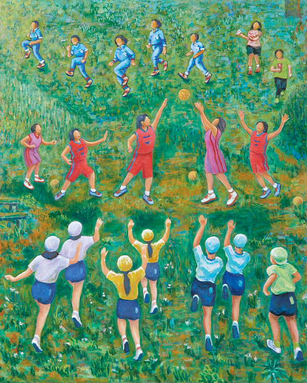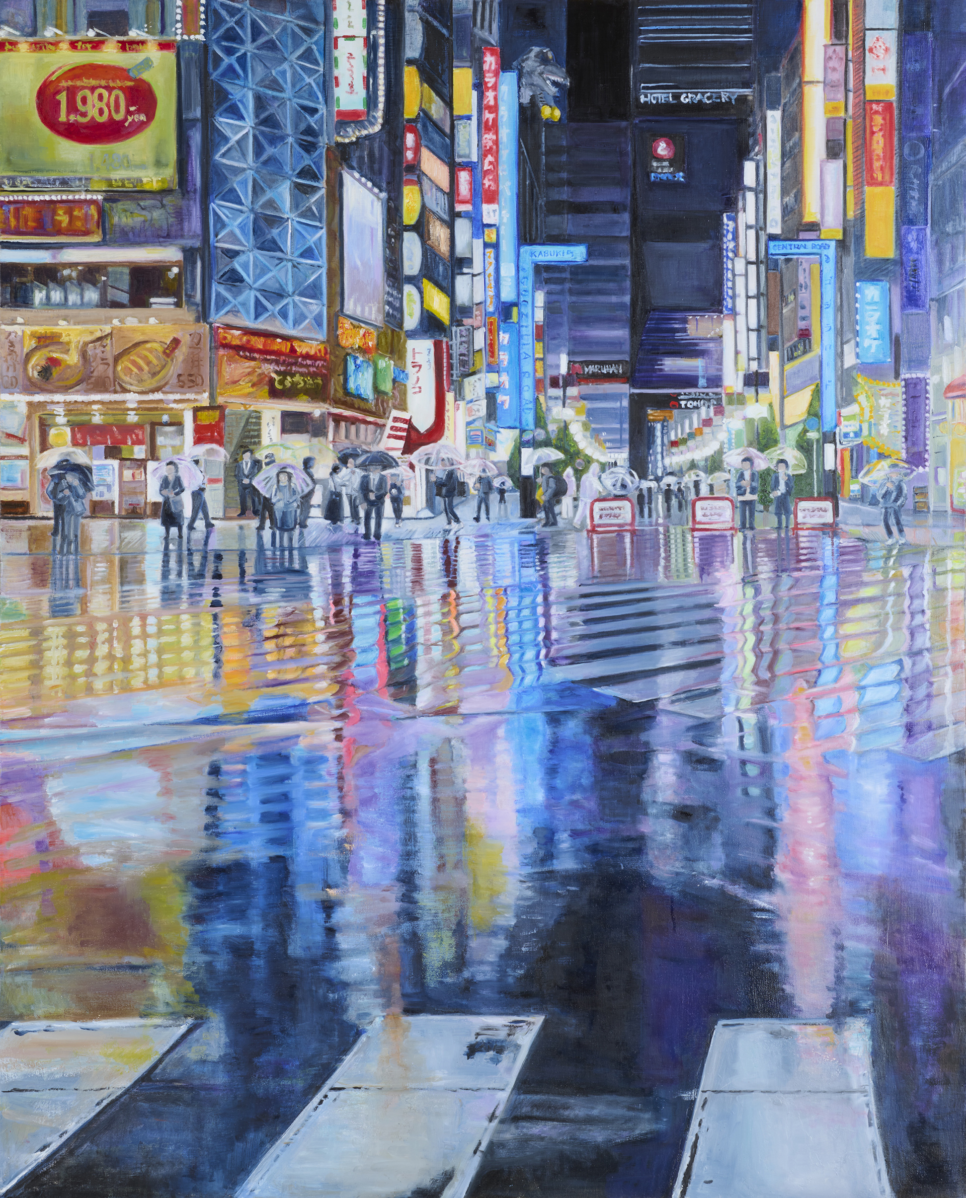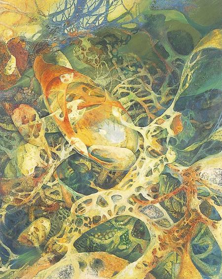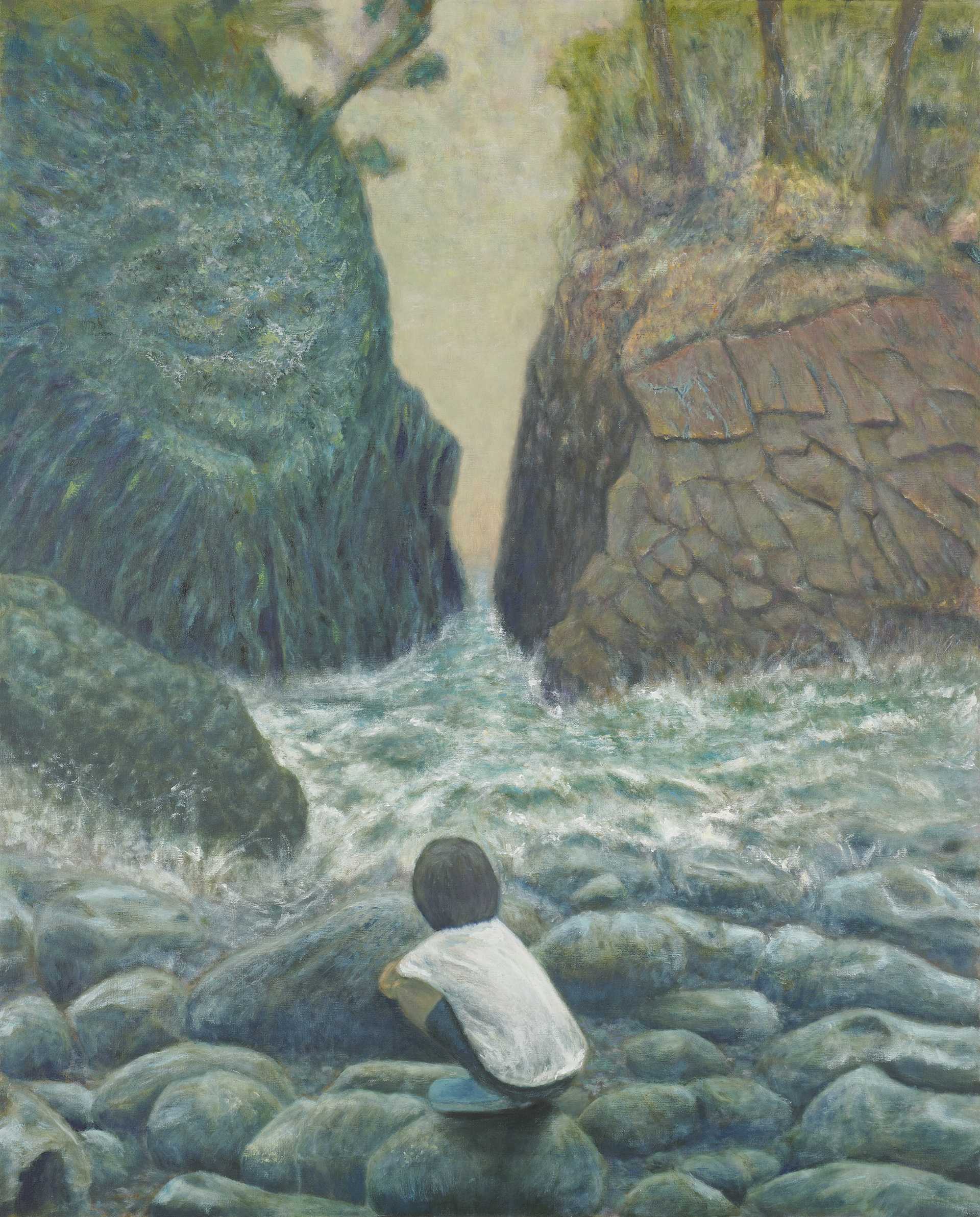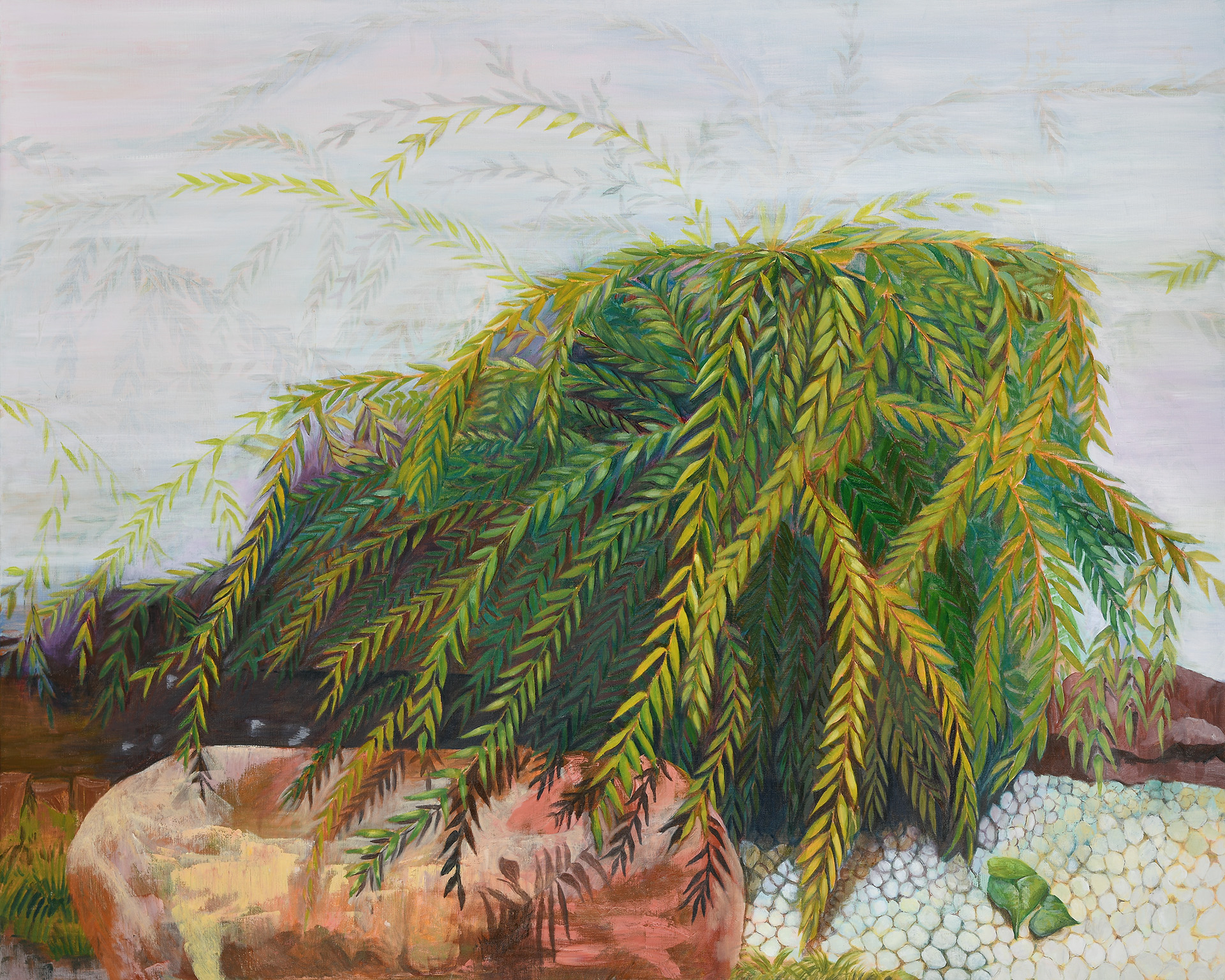 旅先で出会ったバナナの木に圧倒された。威風堂々とした姿、中でも四方八方にのびた大きな葉の力強い葉脈、朽ちても揺るぎ無い姿に、生きる力を重ね合わせた。その時の感動を表現したいと思い、描いた。