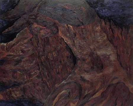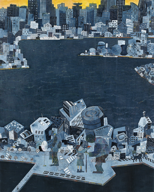 静かに佇む池と、その周辺をぐるりと囲んだ遊歩道のある公園。いつもの散歩道である。水面には光る木々、水際には背の高い水草が群生している。鳥の声を聞きながら、癒される時が過ぎて行く。それらの風景を重ねる色で表現した。