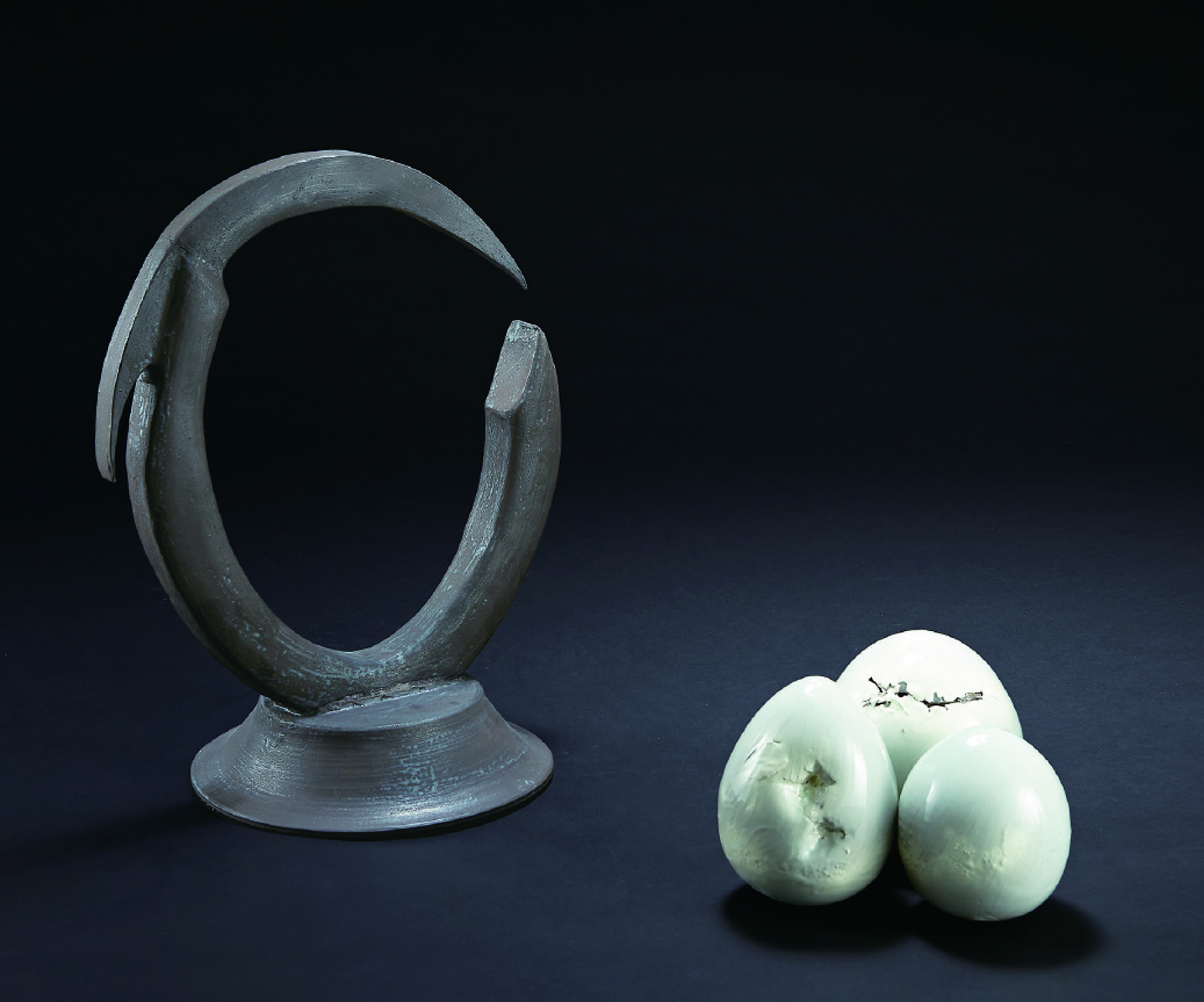 入学時の陶芸未経験から4年間の時間経過を形と色彩で表現する。成長度合いを坂道で黒からの濃淡で全体形を船でイメージした。技法は塊からの削り出し制作として、使用する土は地産の常滑陶土から赤土と大物土2種類を50%配合、色装飾は素焼き後に二酸化マンガンを塗布し、還元焼成で焼き締め焼成をした。