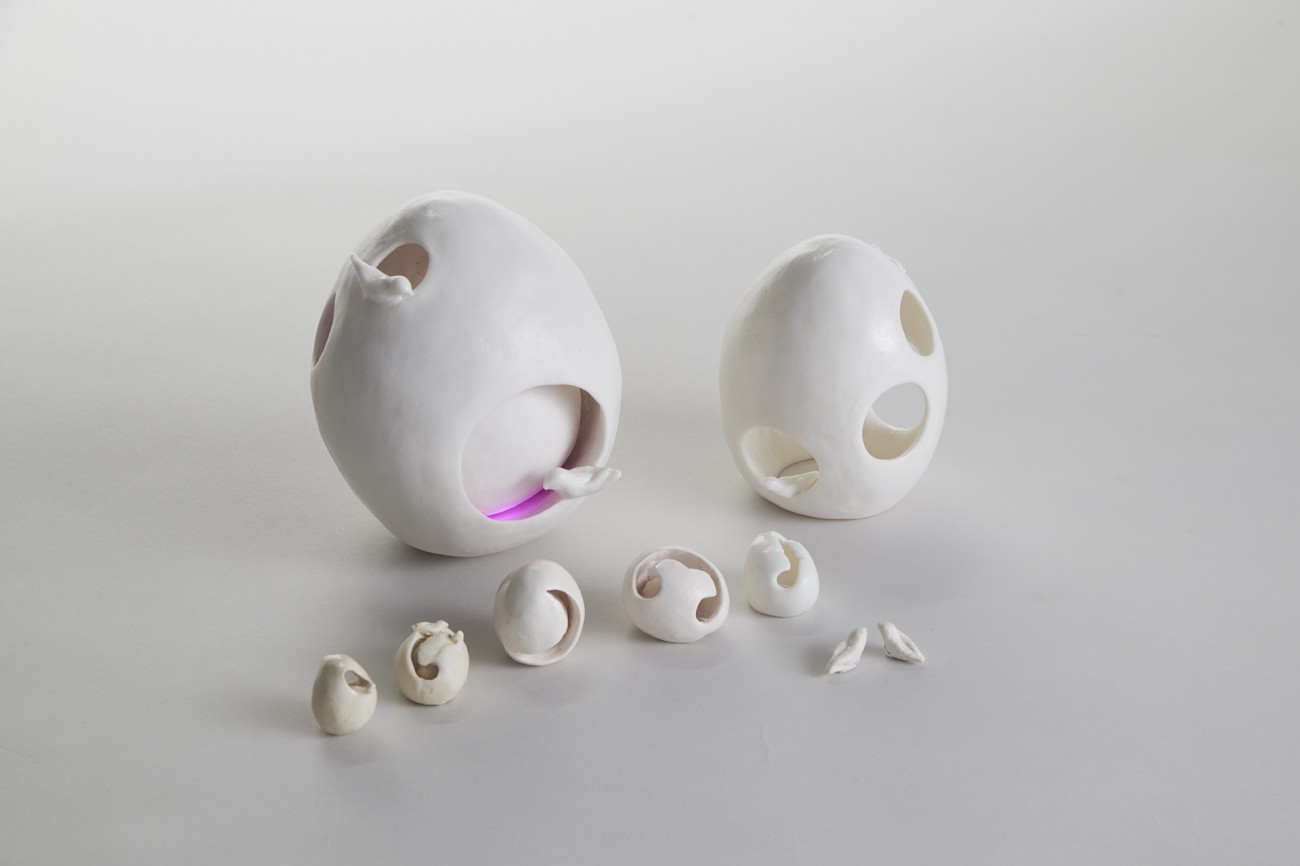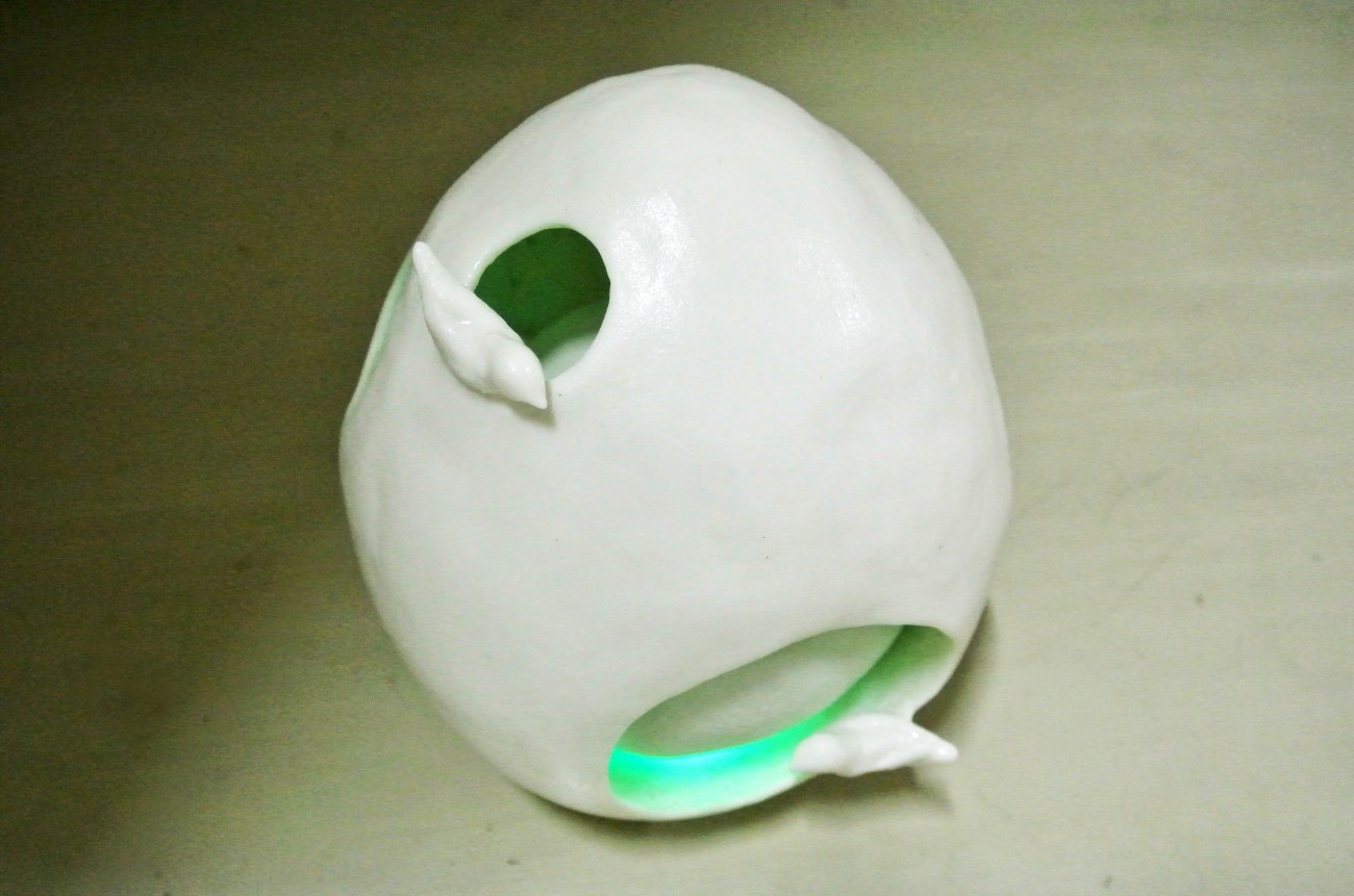 卵型の塊にはCDEF音等のsound hallの小窓。窓辺では卵の大きさからしたらアンバランスな小鳥たちの囀り。平和の旗色を意味する7色(虹色)の灯。