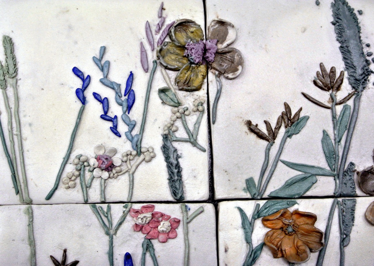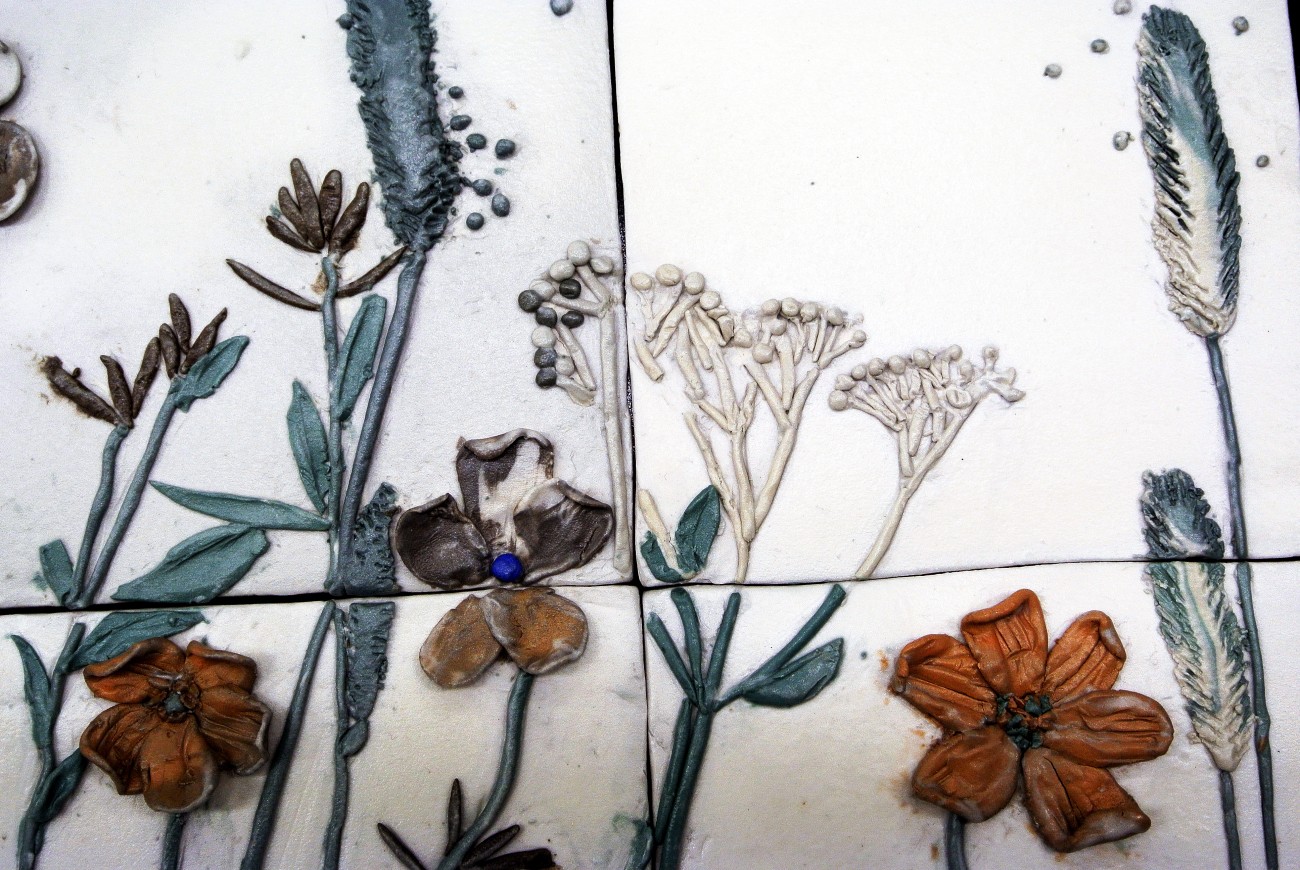 卒業制作は花をテーマにして制作する事にした。花をどのように表現するのか試行錯誤した結果陶板に花を描く事にした。常に散歩している河川敷が、ある日コスモスの花が咲き乱れ、河川敷がコスモスのオレンジ色に染まり、これを表現することにした。