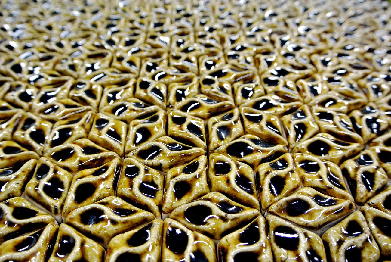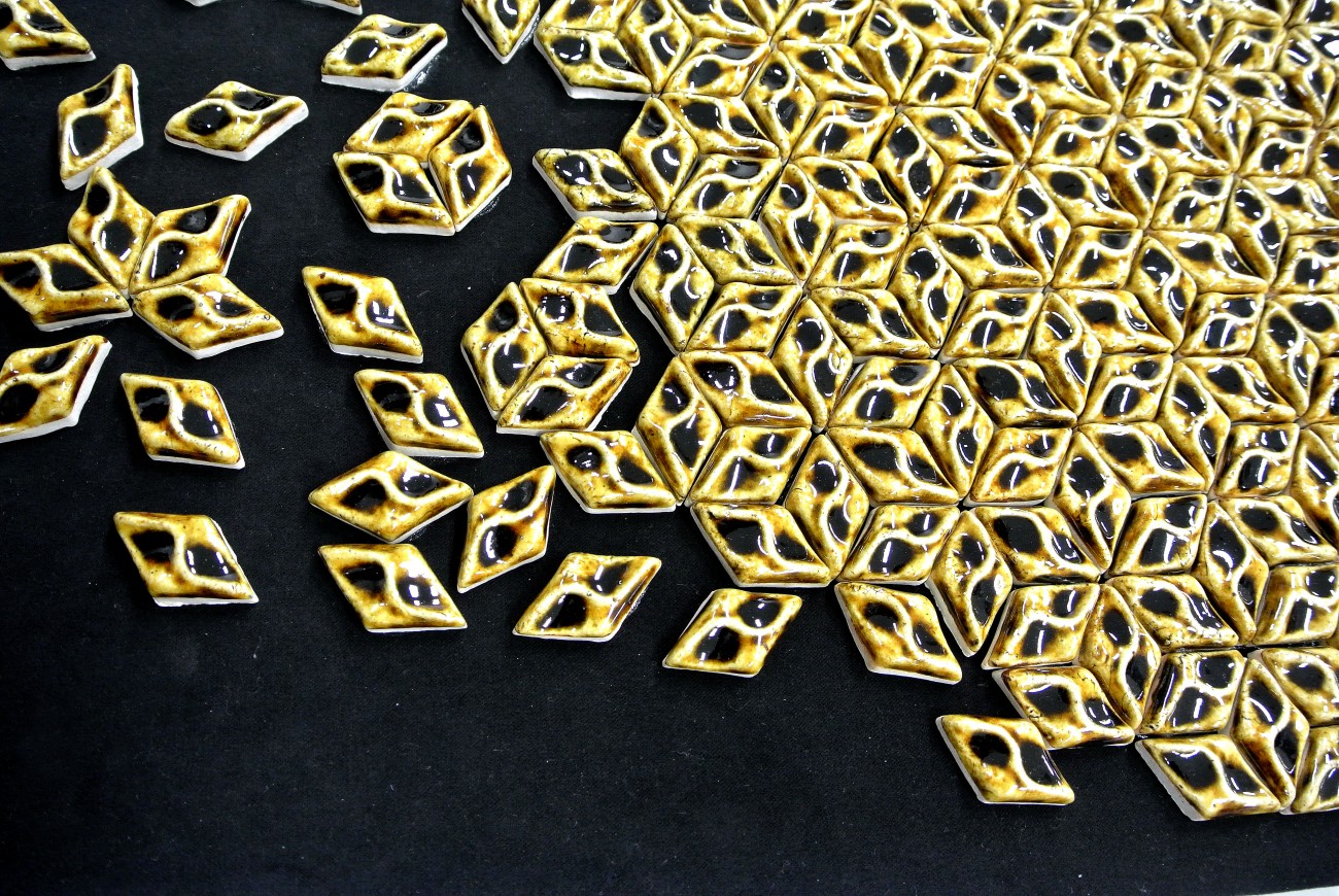 麻の葉模様から創造した平面の中に立体を持つ図案で陶板を制作した。ひとつ一つの片りんからなることを敢えて見せることが可能な点を活かして配置し、タイトルも「henrin」とした。塊として整列したパーツの片りんが少しずつ散らばって旅立つ様子は、卒業という自身の置かれた状況に重なるものになった。