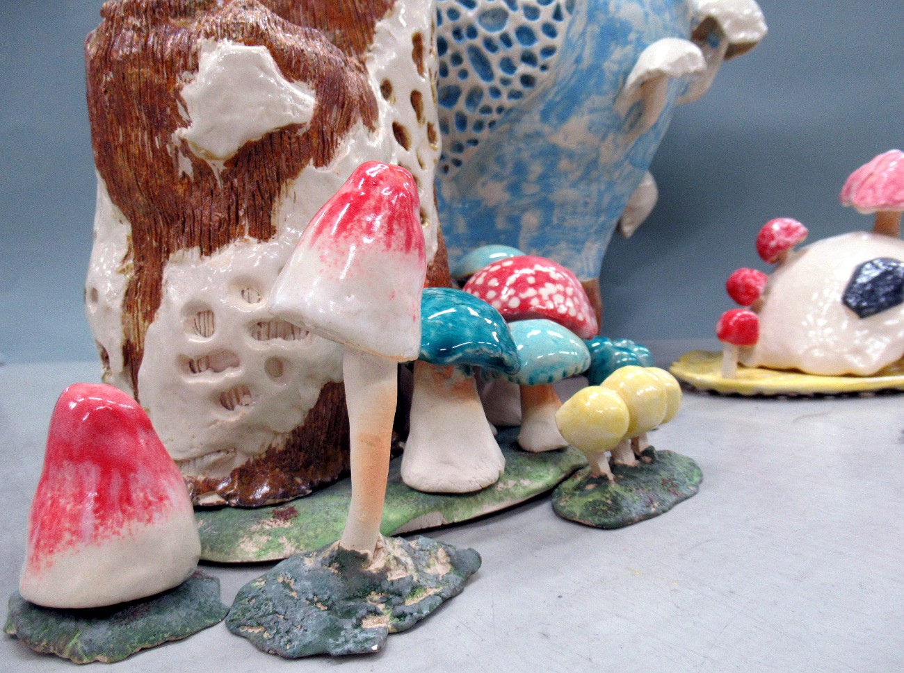 実際にありそうなもの・粘菌を中心にしたイメージを基にしたもの・きのこが持つかわいらしいイメージを中心にしたものという3つの作品を作りました。下絵具と釉薬を複数使うことによって、実際のきのこのように多種多様な色があることを表現しました。