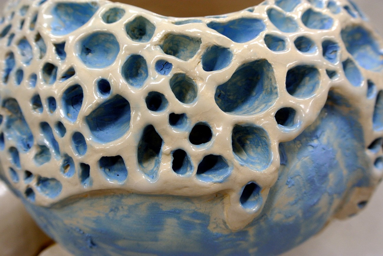 調べていくほど、その生態・色の多彩さ・奥深さに魅了され、きのこと粘菌を卒業制作で表現することに決めました。森の中に群生しているさまざまな種類のきのこと白い網状の粘菌の様子を表したオブジェ、粘菌を主役に空気と水分と土ときのこをシンプルな色分けで現した壷、土台の粘菌にきのこが育ちさらにきのこが群生しているオブジェです。