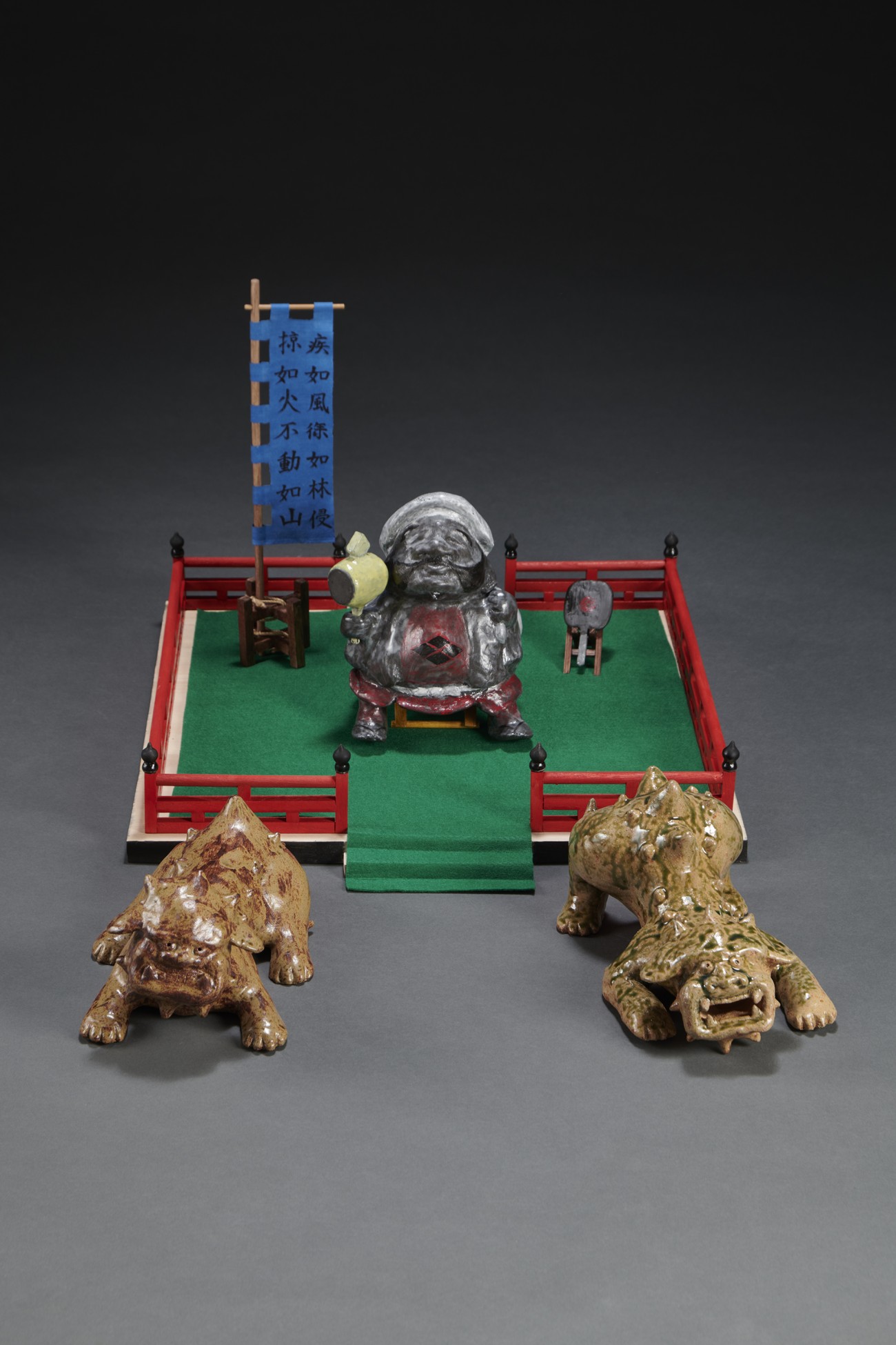 未だに終息する気配を見せないどころか、新たな変異株へとその形を変えて世界で猛威をふるい続ける新型コロナウィルスの感染状況を日々見聞きする中で、この病原菌を含めた一切の災いを祓う魔除けの獅子と、究極の幸福である世界の恒久平和を願いつつ、我が家においても幸多かれとの思いから招福の大黒天を制作することとしたのであるが、独自性を考慮して最終的に構成をイメージしたのが、圧倒的な強さを誇った戦国最強・武田騎馬軍になぞらえてみることであった。