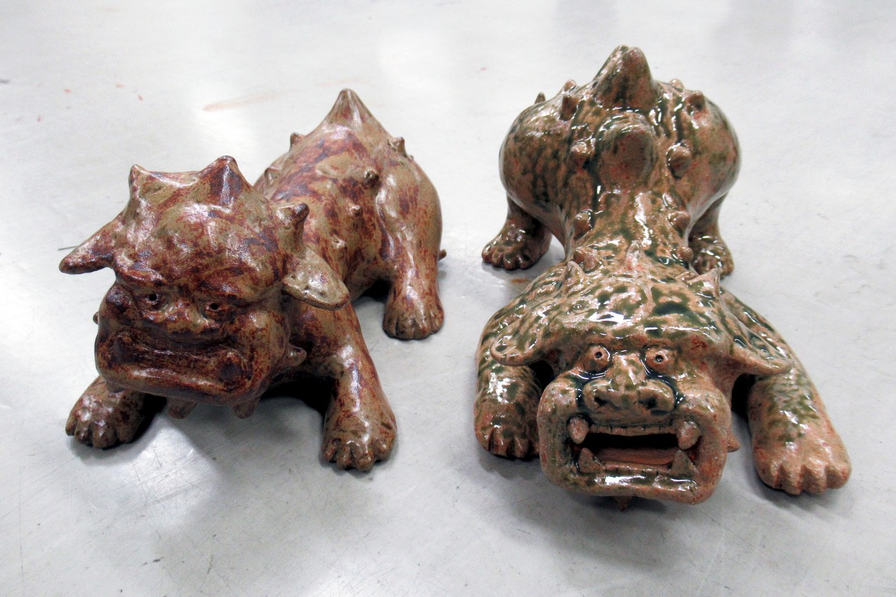赤土, 黒陶土/伊羅保釉, 酸化緑ビードロ釉, 石灰透明釉/酸化, 上絵/手びねり