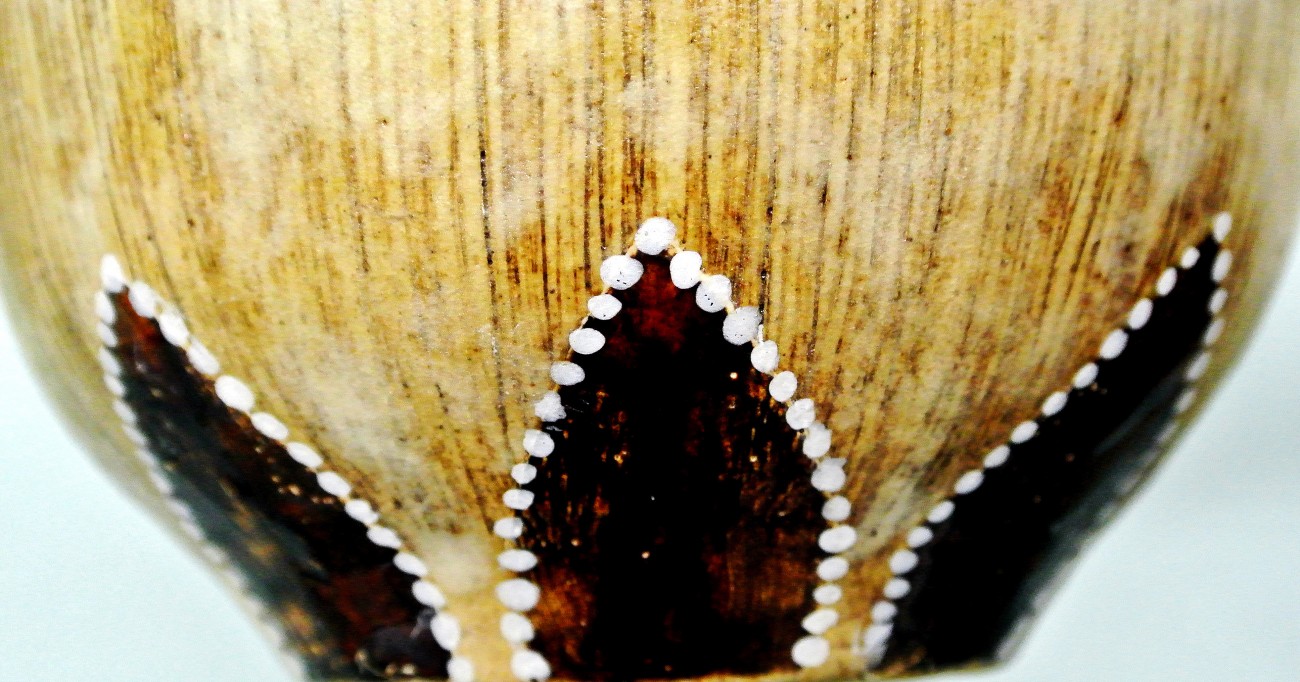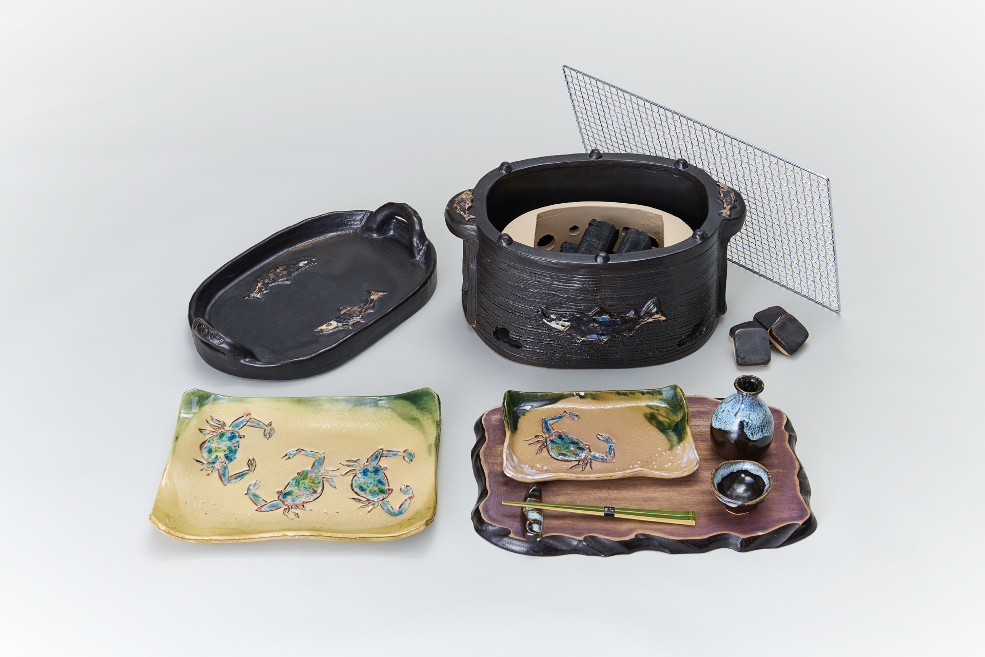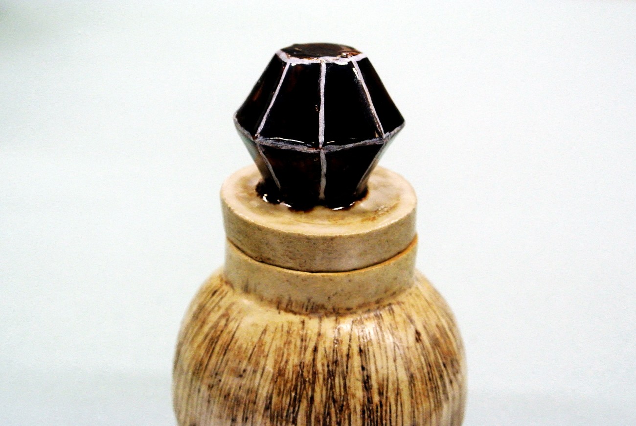土は、地元広島県の西条薄赤土を使った。青色ベースで考えていたが、いろいろ試し、土と相性のいい茶色ベースとした。スジの模様に茶系の色を付け、マットな釉薬とあめ釉でシックに仕上げ、銀色の上絵の具で装飾した。 【修正なし】