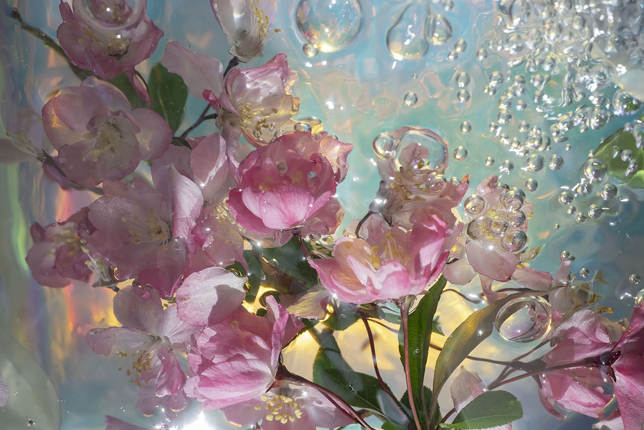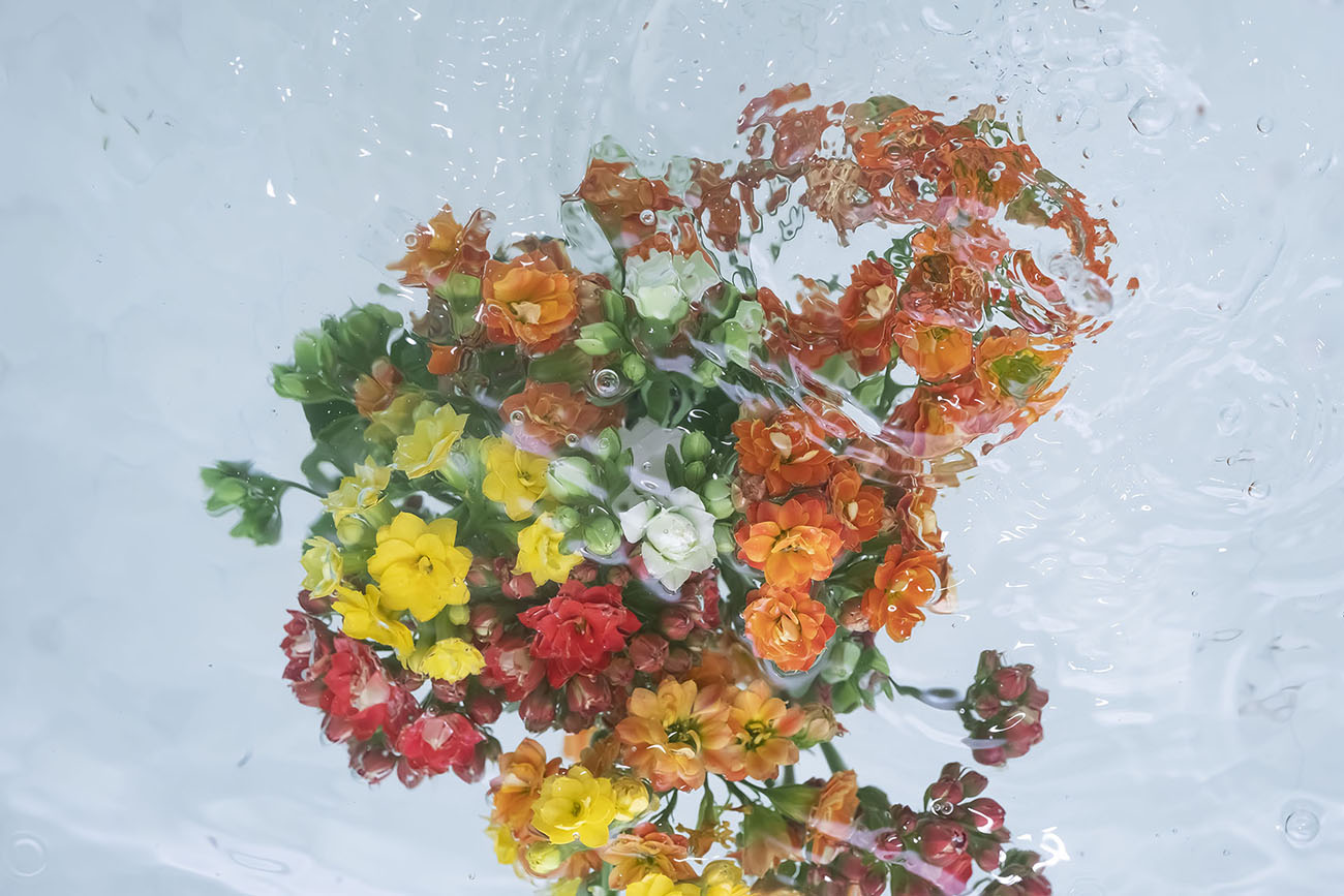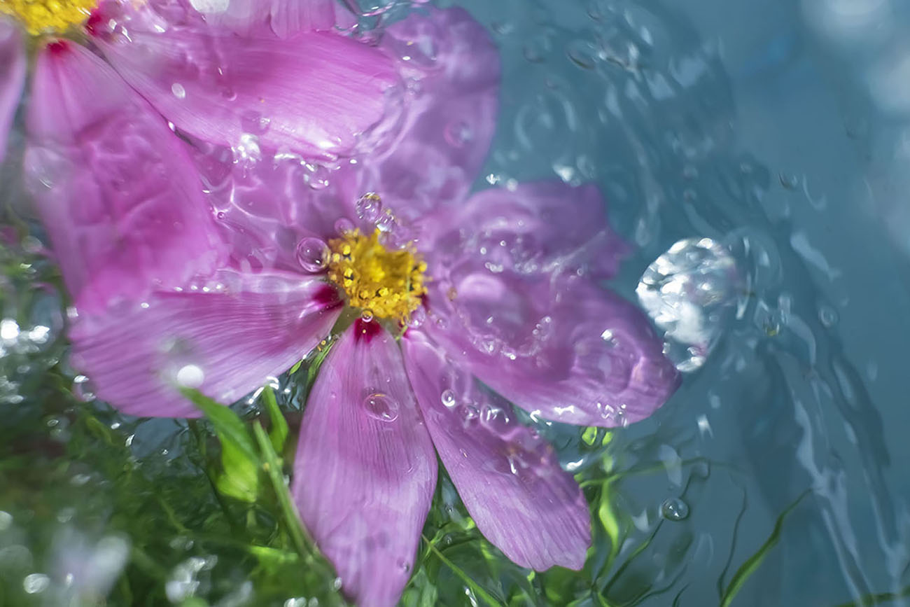 植物や花を水に沈めて飾るサブマージフラワーを参考に、軽く心地よく水が流れるような流動的、水に植物や花を沈めることで偶然できる色や形、水模様や植物の形を探究したり、見る人が自由に解釈して植物や水模様が心に潤いを与えられたら幸いです。