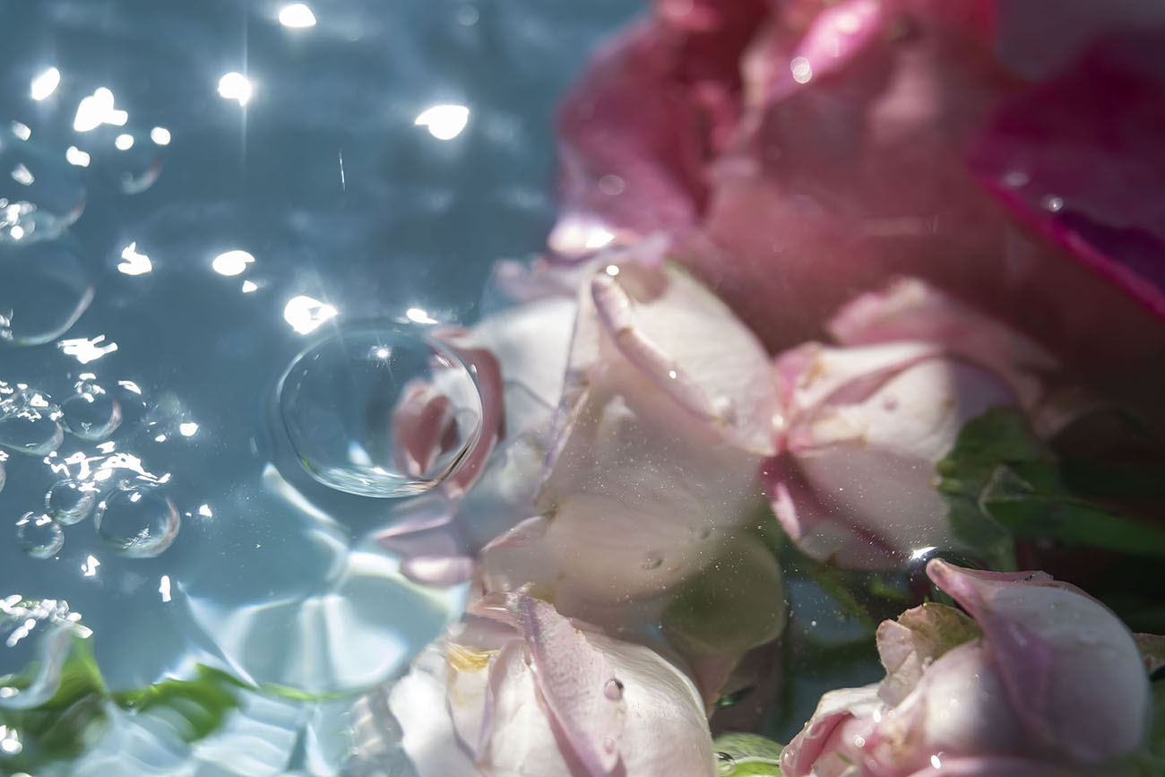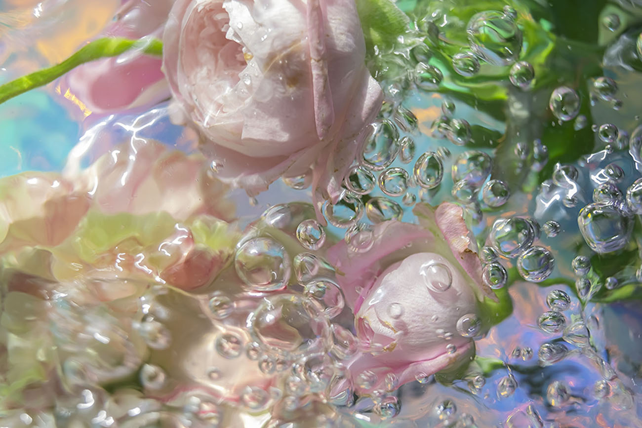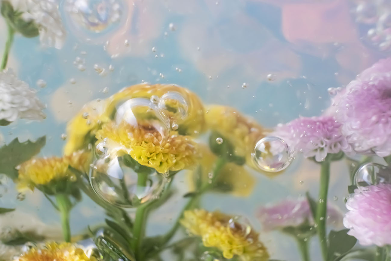 植物や花を水に沈めて飾るサブマージフラワーを参考に、軽く心地よく水が流れるような流動的、水に植物や花を沈めることで偶然できる色や形、水模様や植物の形を探究したり、見る人が自由に解釈して植物や水模様が心に潤いを与えられたら幸いです。