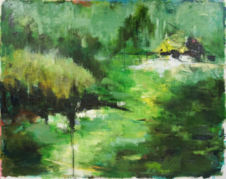 それは森の刻を意識する事であった。その刻々と変化する森の中で風がどの様にそよいでいるか、森は雨や風や生物をどの様に受け止めているのか。森は長い年月の間全てを内包しながらそれらと一体化していく。そこは目に見えるもの以外にも、記憶やあらゆるものが積み重なり続ける場所である。そんな記憶の中にある風景を描くうち、強く印象に残っている物の具象と言う形がそぎ落とされ、平面化、簡略化されていく。そして記憶の中に埋没していく刻を重ねて表現する事で心象的風景画に構成されていった。