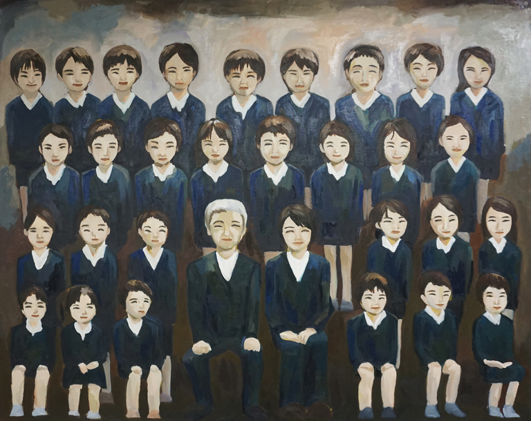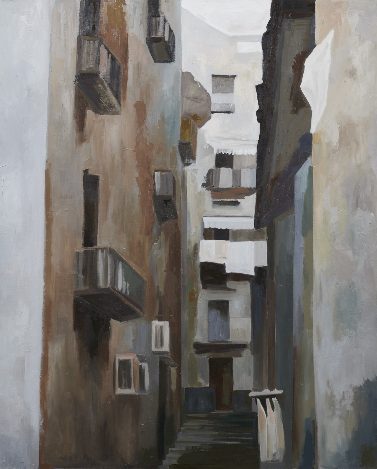 街中の一角が印象的で、とても好きな色合いに心を奪われた。全体的にくすんだグレーや茶系の色を使い、混色や色を重ねて描いた。自分にとっての心地よい色とはどんな色かを考え、描いていくうちに、色の深みを感じられる暗い色や淡い色などが心地いいと思うようになった。一見、変化が少ない色の中にも多くの色が含まれている。落ち着いた静かな色で描かれたものの美しさを感じられるように描いた。
