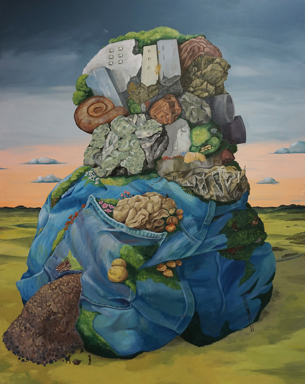 自分の根底にある哲学や思想をもとに、絵画を通して分解や表出を行うことを目的とし卒業制作を行った。私自身が現代社会で感じる、女性の社会での生きにくさや息苦しさを抗議の意思を持って表現した。女性特有の丸みのある身体を複数集合させひとつの固体にし、布や紐で縛られがんじがらめの中でもがく様子から、動きがあり大きなエネルギーが感じられる作品にした。