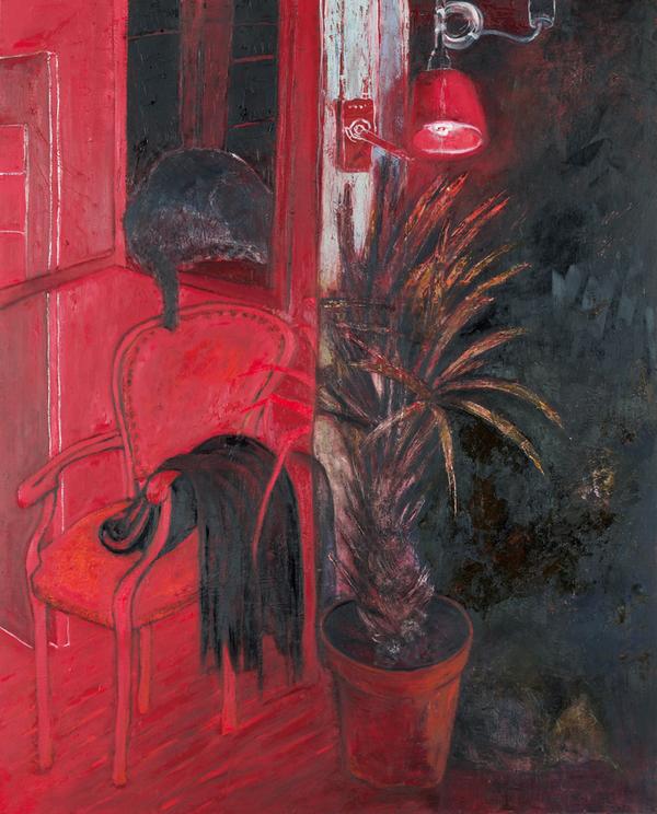 家人が織り機や御光台のある部屋で針仕事をしている。作業に集中する姿は、日常そのものである。屈み込んだ背中や、二面の窓からのカーテン越しの光を受けて針仕事の手元を見つめる逆光の顔のシルエット。人物や部屋の陰影表現を通して手元に視点が向くこと、また空気感が伝わることをめざした。ピンと張られた細い糸や机上の鋏に日常の危うさを託した。次の瞬間、この日常が続いているとは限らない。
