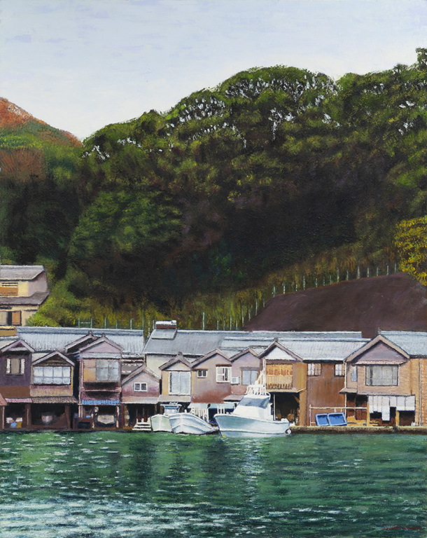修了作品の制作にあたって、以前から描いてみたかった京都府伊根町の舟屋群を取材した。船が入る事が無くなった空洞の内部が暗い舟屋と、その前に係留されている大型船の対比を表現した。取材したのが晩秋という時期であったが、海に近いせいもあり紅葉は始まったばかりで、色付き始めた山々の深さと、日を浴びて輝いている舟屋群の対比を表現した。穏やかな湾内の情景を表現するため暗い波間と明るい波間を幾筋も作って描画とグレーズを重ねて完成させた。