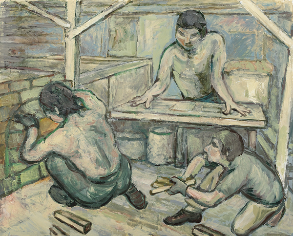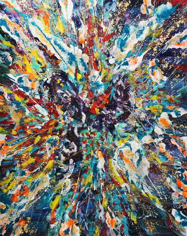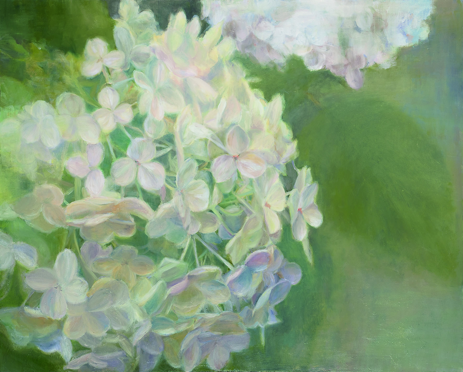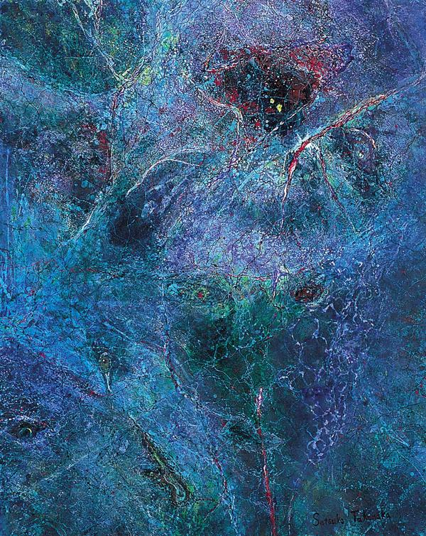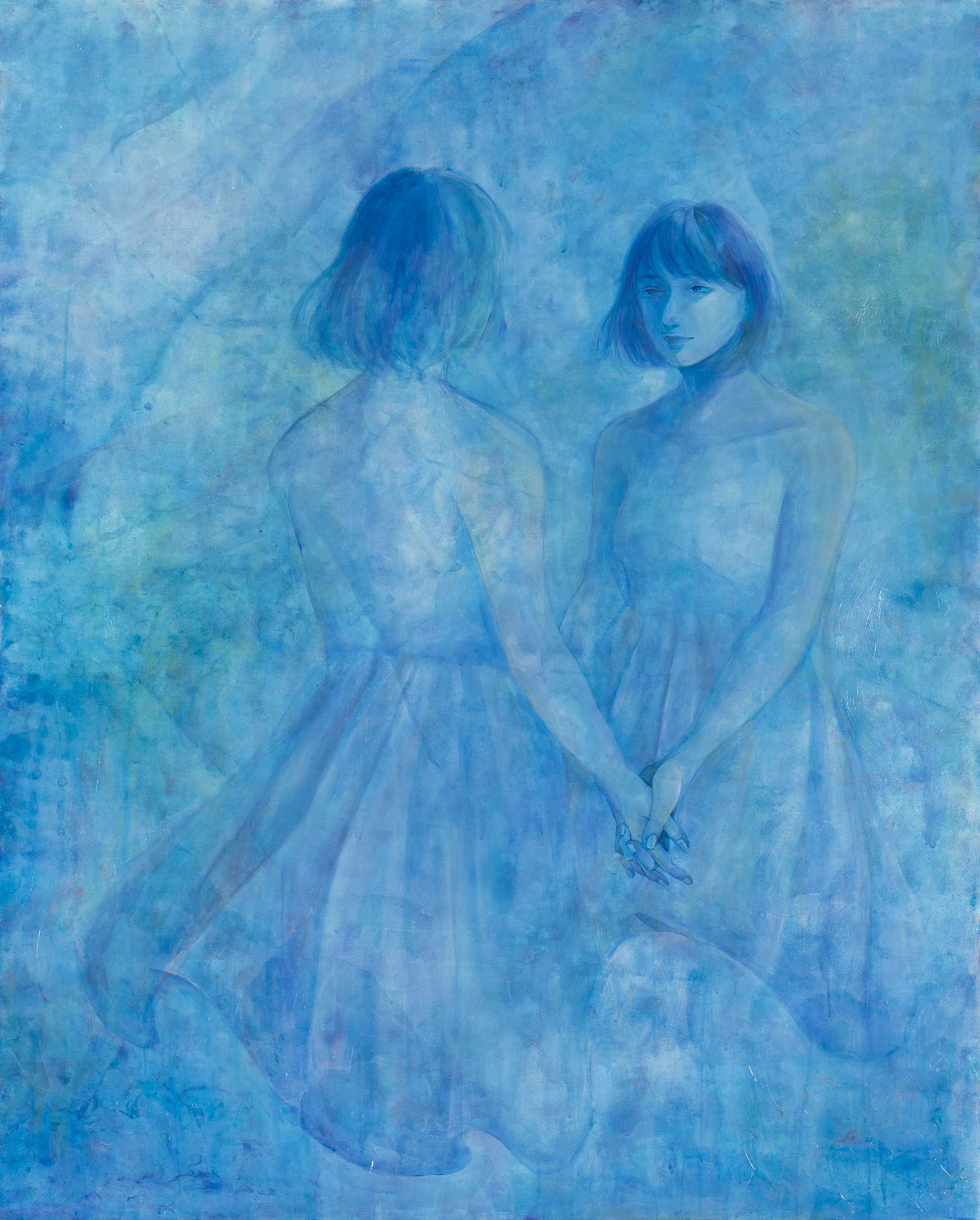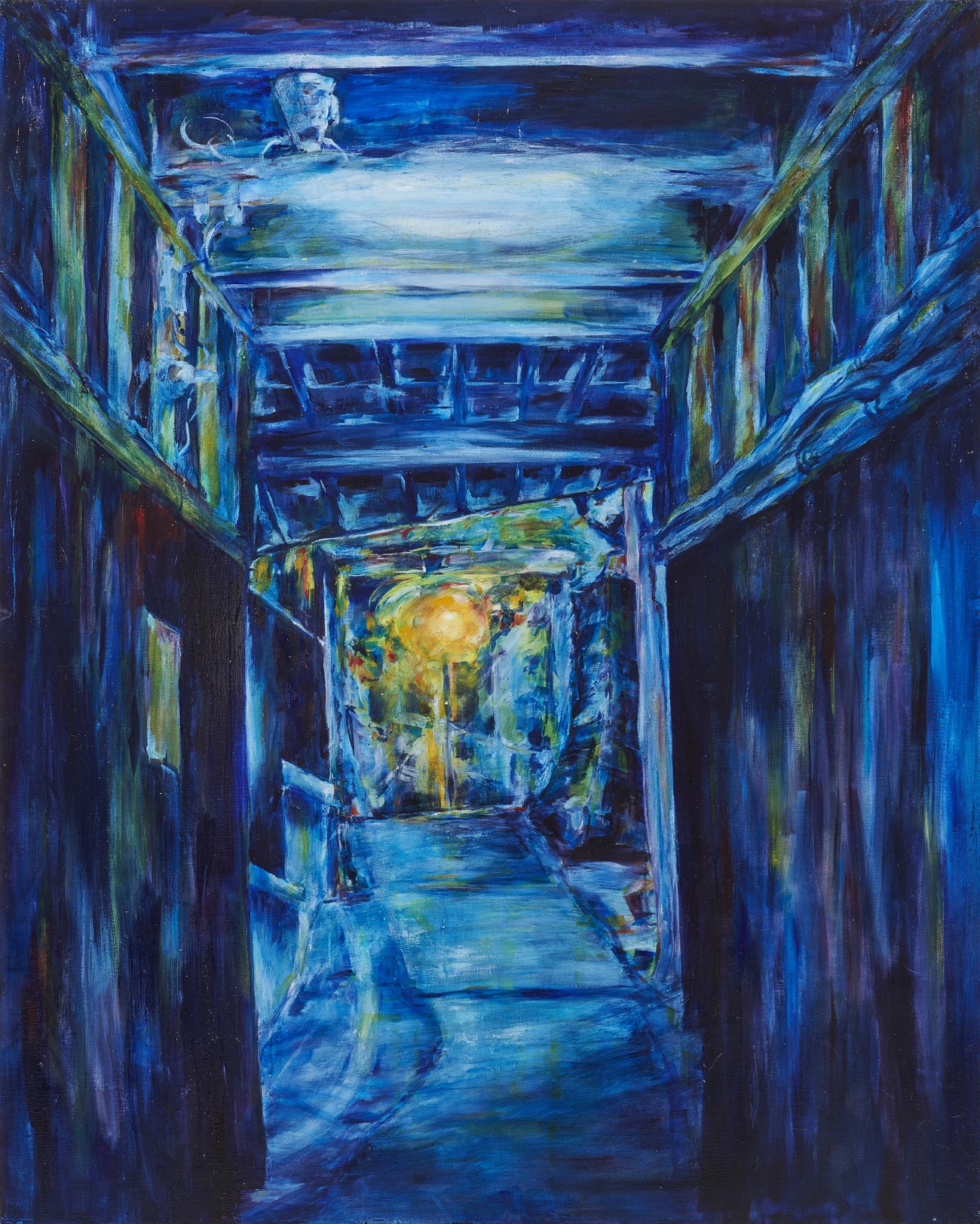 雨上がりの夕刻から夜になる時刻。町家の板張りの回廊を抜ける石畳の向こう側には石垣と、石で作られた鳥居。町家からはオレンジ色の電灯が点き始め、石畳の終点には鉄柱の上の電灯が夕刻の斜め上からの陽の光と交差している。板張りの回廊の天井の蛍光灯が、杉板、土壁、梁に鈍い光を与えている。