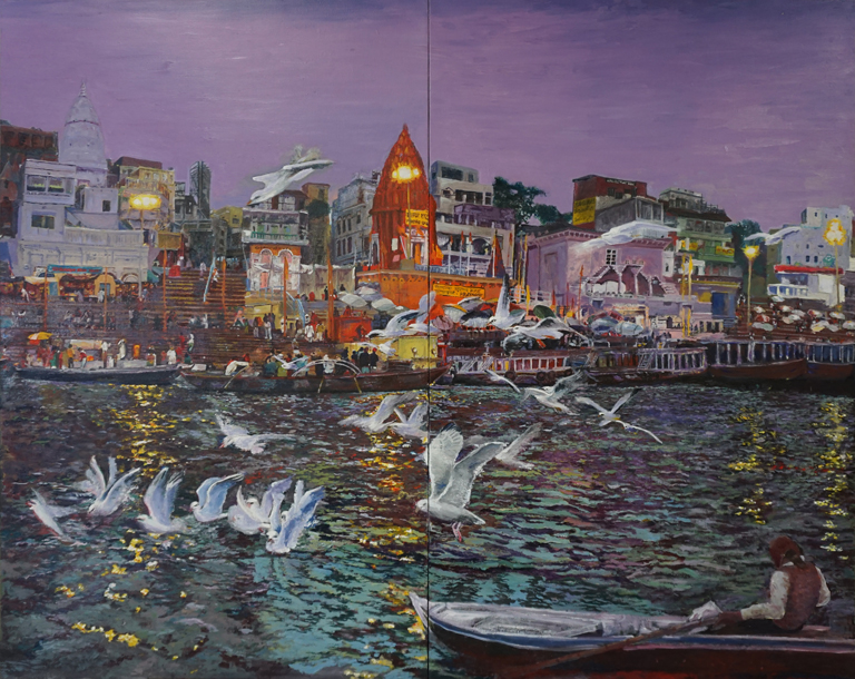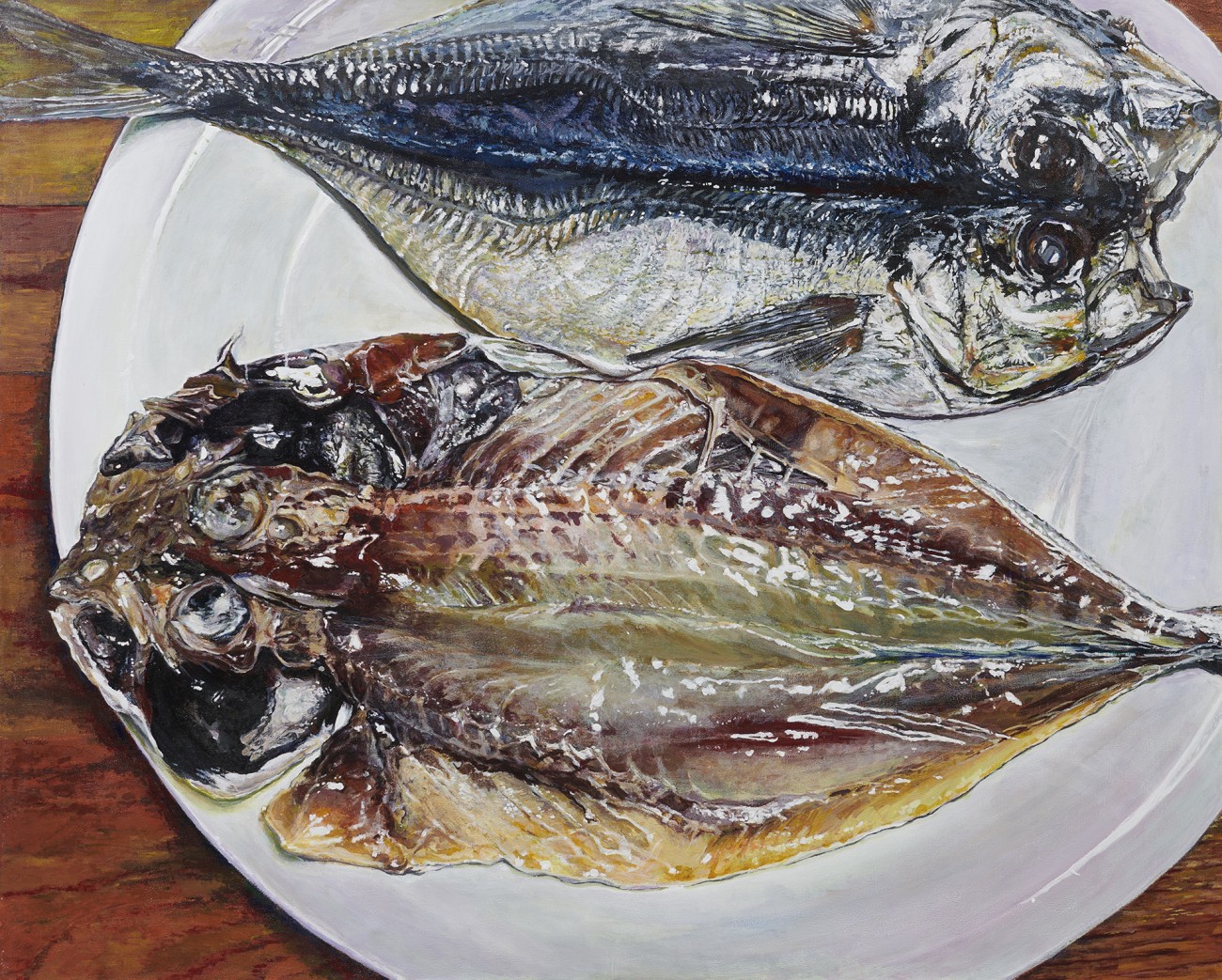 ある日、「鯵の開き」を目にした。身近にあり生でもなく、焼かれてもいない艶々した旨そうな干物を見て100号に描いたらどうかと思い挑戦した。うろこで身を守る外側と内側の感触の違い、内側の秘密めいた複雑な構造をどこまで描くのか。やわらかい部分と骨などの硬い部分の材質の違いをどう表現するのか、外側のゼイゴの硬さが表現できるか悩む。出来上がってもとても部屋には飾れないかなと思いつつ描いてみた。