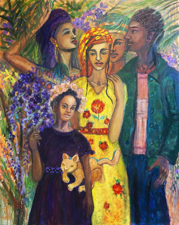 テーマは「アフリカ」である。ルソーの《夢》から、発想を得た。アフリカのジャングルの中にソファーを置き、黄色のワンピースを着た女性を描いた。黄色は、元気、快活、希望を喚起させるからである。ソファーは補色の青にした。横に子ヒョウと右上に熱帯の鳥を描いた。背景のシダなどの植物を一気に描いて、女性、子ヒョウ…と更に描き進めた。窓外の木漏れ日が美しく、それを絵の背景の光に活かした。
