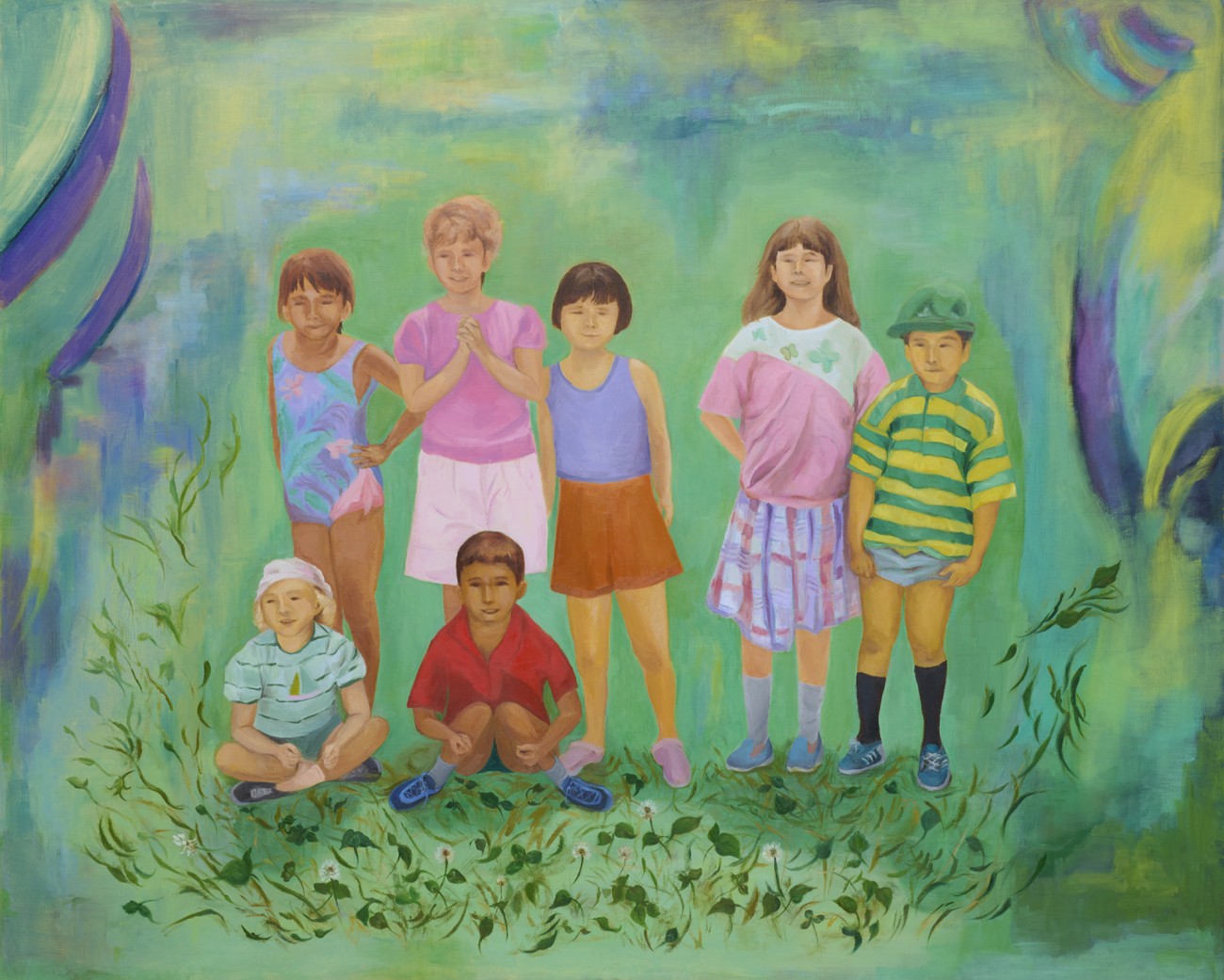 自身の人生のターニングポイントとなった出産・育児を日本から遠く離れたカナダで経験した。長男が通った現地の幼稚園には多くの移民のこどもたちがいた。文化や母国語の違うこどもたちだが、みんなそれぞれ明るく自由にそして逞しく過ごしていた姿が今でも心に残っている。そのような心象を背景の色彩で表現し一枚の絵にした。
