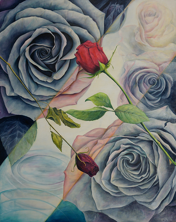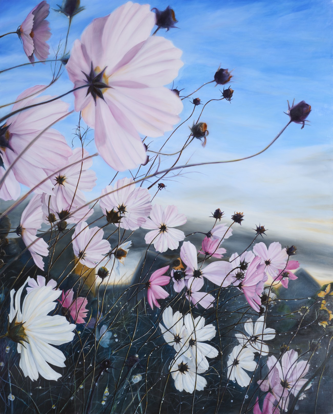 2022年度は主に花の絵ばかりを描いた。花の造形や色香、花がおりなす風景、空気感、そういうものに創作意欲が刺激されてきた。この作品は10月11月を取材と構成にあてたがまとまらず、12月からキャンバスに描き出しと、かなり遅いスタートだった。ただ取材と構成に要した時間は無駄ではなく、苦しんだけど有意義だった。まだ未熟で、自然が見せる美しさをつかみきれていないと実感するけれど、この創作の幸福感があれば、きっとまた次の絵を描くことはできるはず。