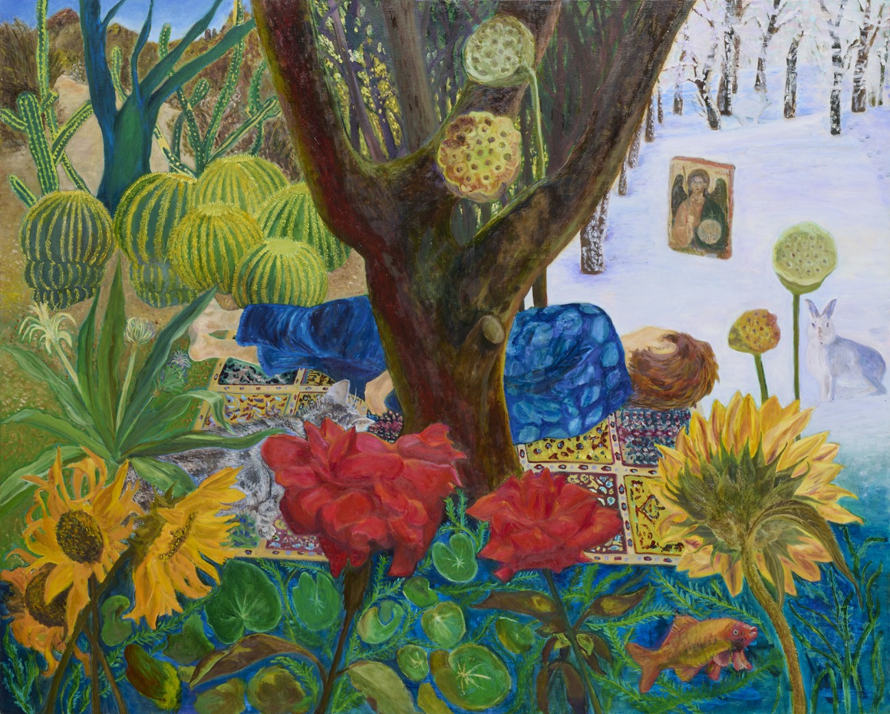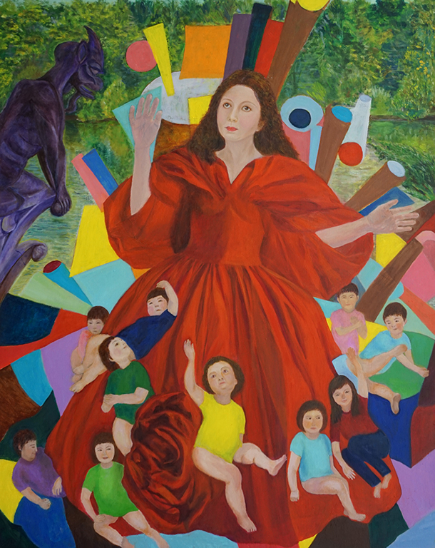 100号を描いてみると、不思議と度胸が据わってきた。同時に自分が何を表現したいのかをそのモチーフと対話できるようになった。自分を掘り下げるとまず幸福感について考え、次にこだわりが見えてきた。心の癖と仲良く手を取り合いながら絵の具を絞り出し、パレット上でのたうち廻りながら彩色した。フォルムと色彩がぴたりと決まると、100号キャンバスの前にはオリジナルな幸福感に包まれている私がいた。