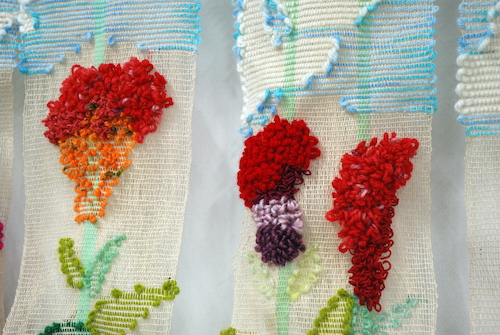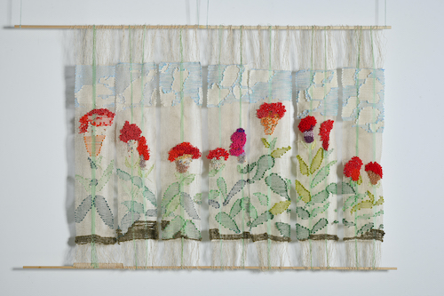 大好きな鶏頭の花でいっぱいの畑があったらいいなと想像して作りました。かすかに木の香りがする木糸を使うことで、より透け感や自然な感じが出ればいいなと考えました。全体的に少しもこもこしているところが自分の中では気に入っています。1枚ずつできるので、のれんとしても使いたいと思っています。