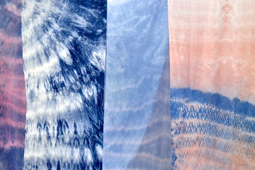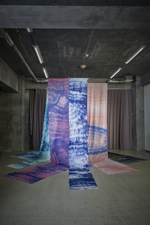 絞り染ならではの繊細で、どこか大胆さも感じられる模様、また作品同士の重なりから、雄大さの表現を目指しました。