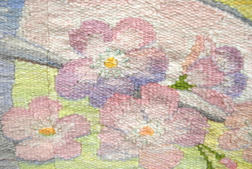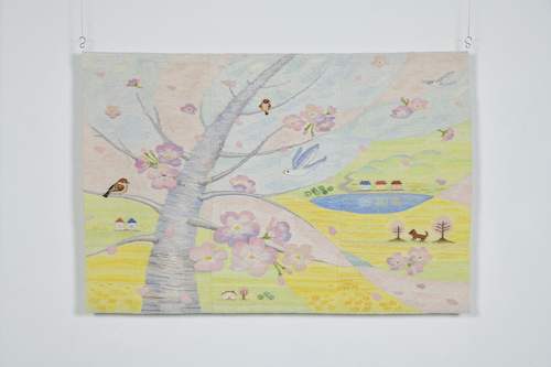 春が来るたびに眺めてはその美しさに感動している自宅近くの春景色を表現した。桜の伸びやかな枝と花をメインに、その共演者は、菜の花畑、若草色の草原、淡い空色など。そして、犬や鳥たちも「春が来た」と春の訪れをよろこんでいるようである。