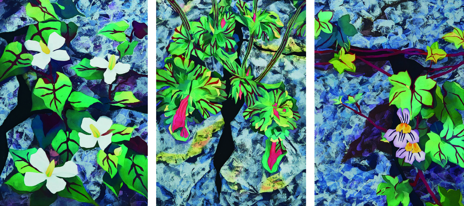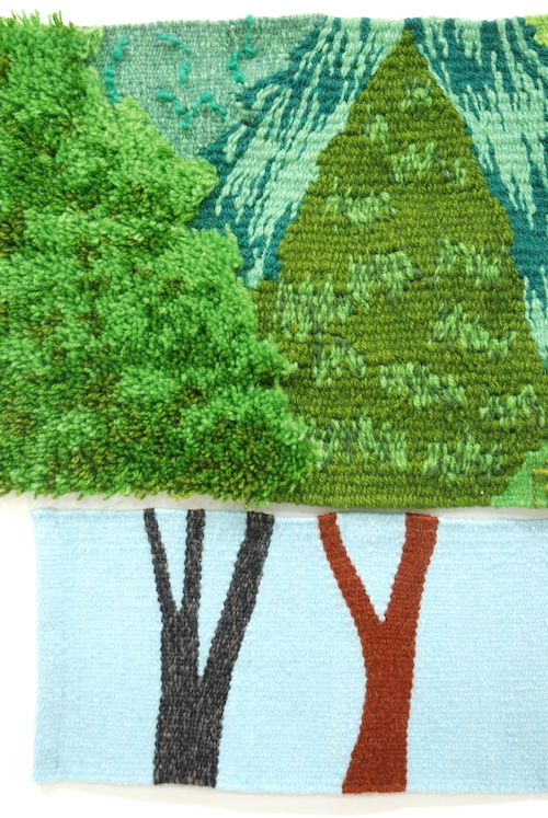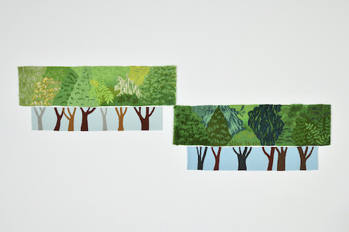 何があっても、いつも通り移り変わる自然の強さを感じながら、新緑の柔らかい優しい緑と、夏の頃の力強い緑の木々を綴織で表現しました。