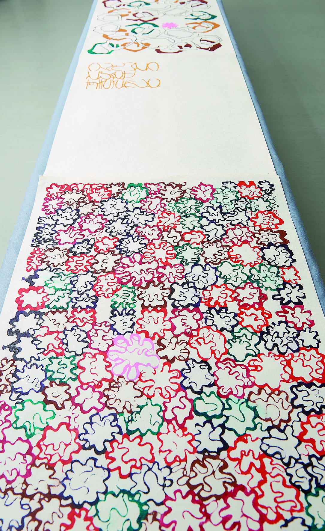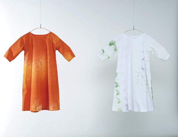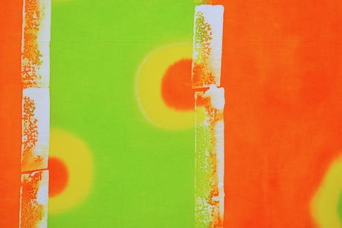 色が水に乗り、繊維を伝い歩く。そして現れる“染”の不思議。色はロウで防染されると堰き止められて向こうへ行けない。濡れた繊維の上は、行けるところまで進んでぼんやりと滲む。行ける・行けない。混じる・混じらない。ロウと染料の特性を用いて、学生生活という旅の中で見つけた“二極の性質が同居する自分自身”の姿を描いた。