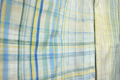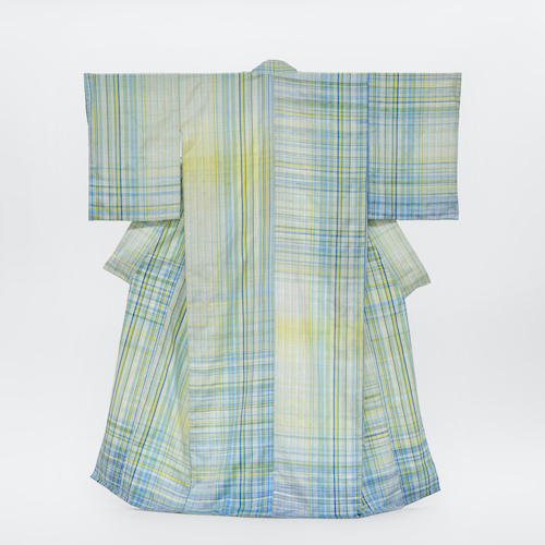 柳と流れ(川)をテーマに制作した着物です。白川の近くに暮らしていた頃、川の流れと柳の木々が生活の傍らにあり、川岸の道を歩くたび、その情景と流れの音がこころの塵を流してくれるようでした。柳の葉を経糸の縞で、川の流れや葉を揺らす風を緯糸で表現しました。