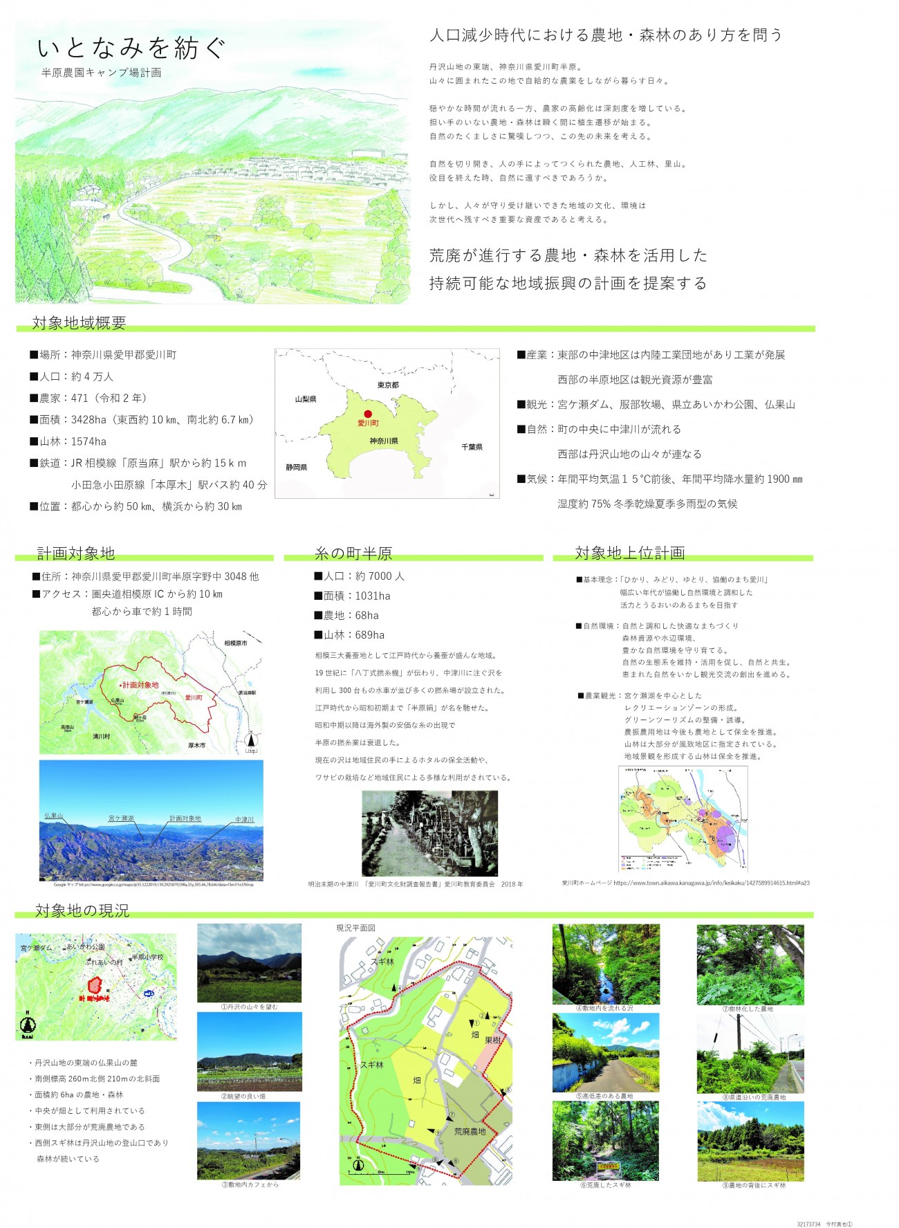 丹沢山地の東端、神奈川県愛川町半原。山々に囲われたこの地で自給的な農業をしながら暮らす日々。担い手不足により周辺の農地、森林は年々荒廃が進んでいる。自然を切り開き、人の手によってつくられた農地、人工林、里山。役目を終えた時、自然に還すべきであろうか。しかし、これらは人々が守り受け継いできた地域の文化、環境であり次世代へ残すべき重要な資産であると考える。そこで地域の課題である、荒廃が進行する農地・森林を活用した地域振興の計画を提案する。