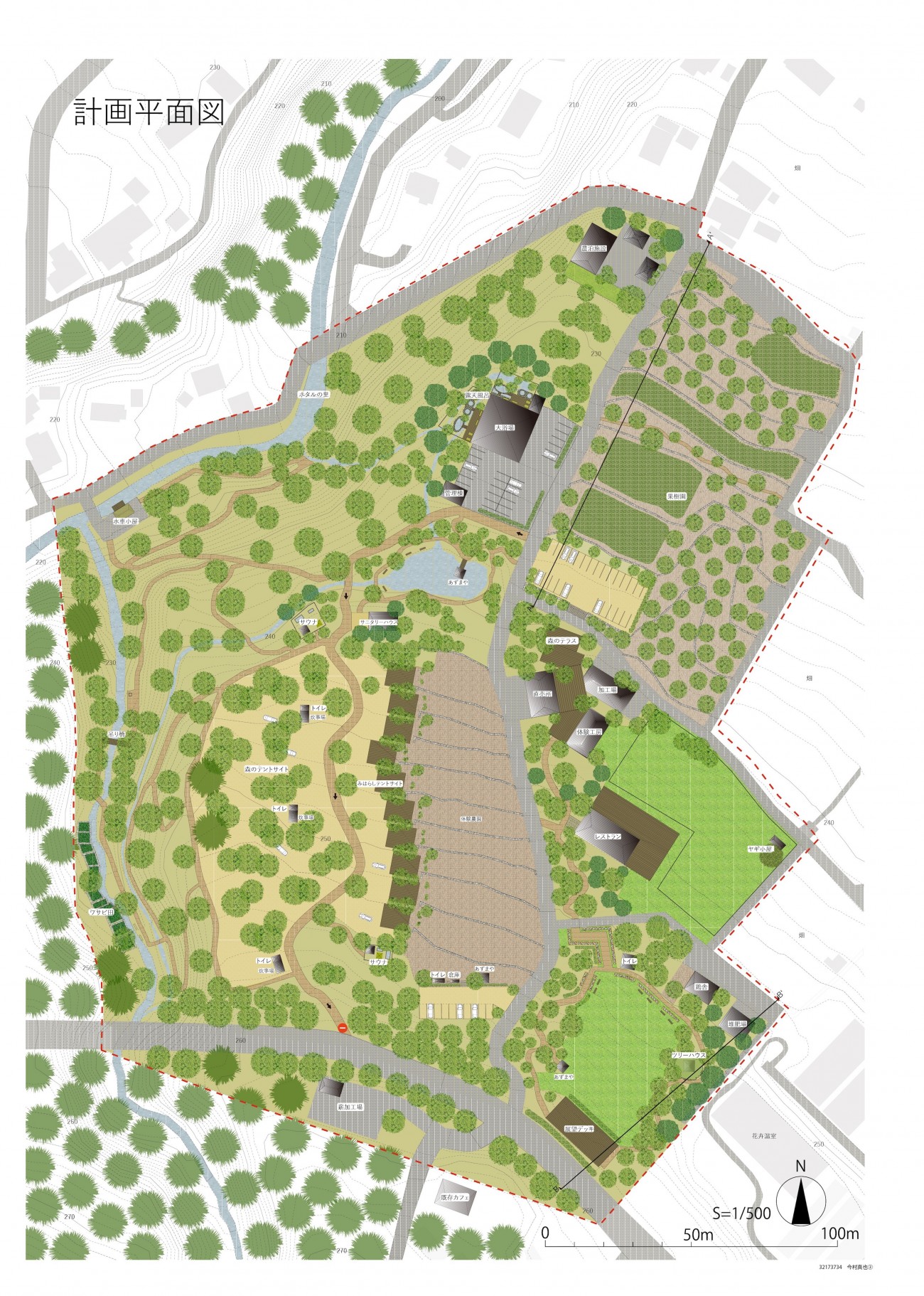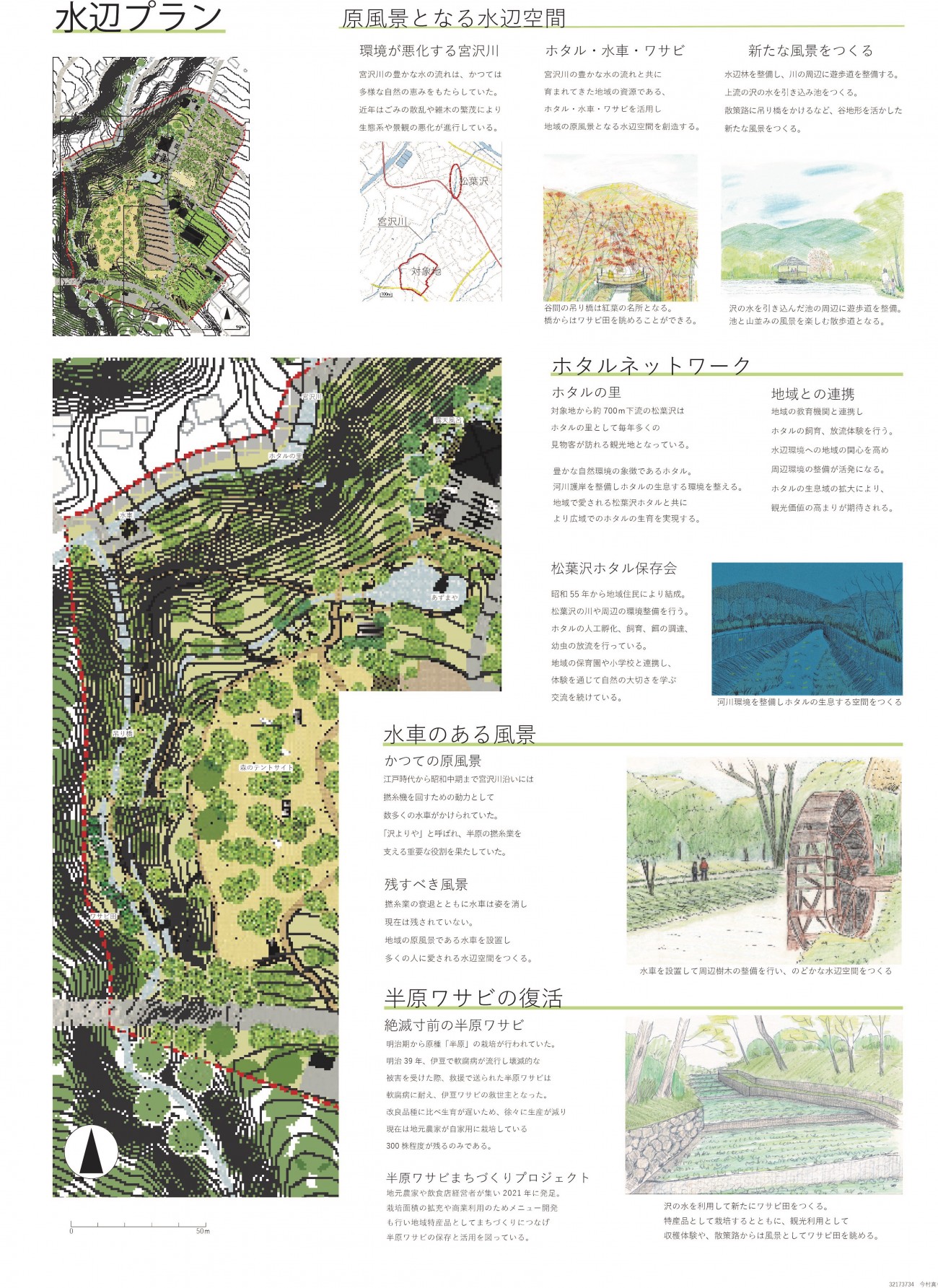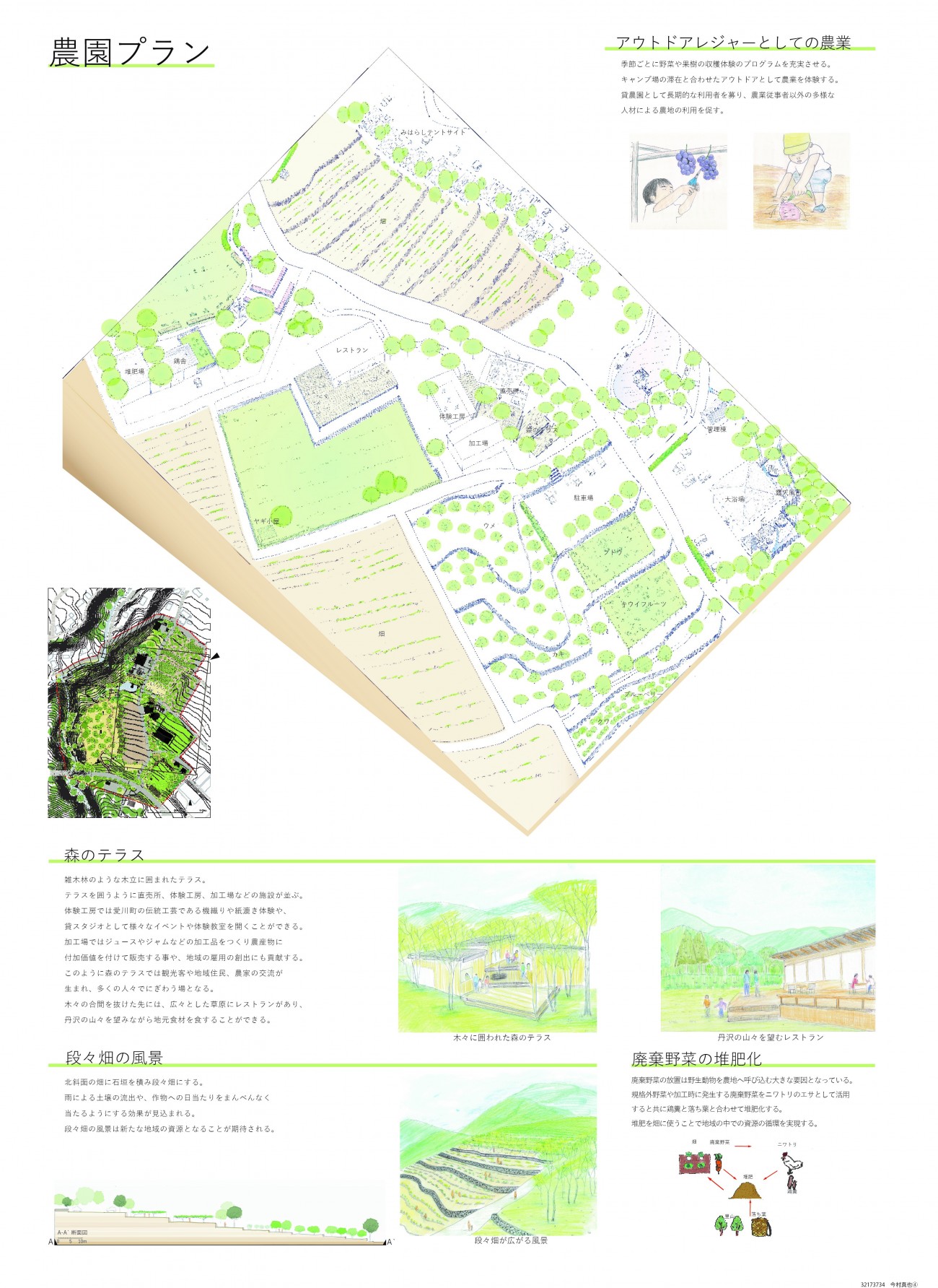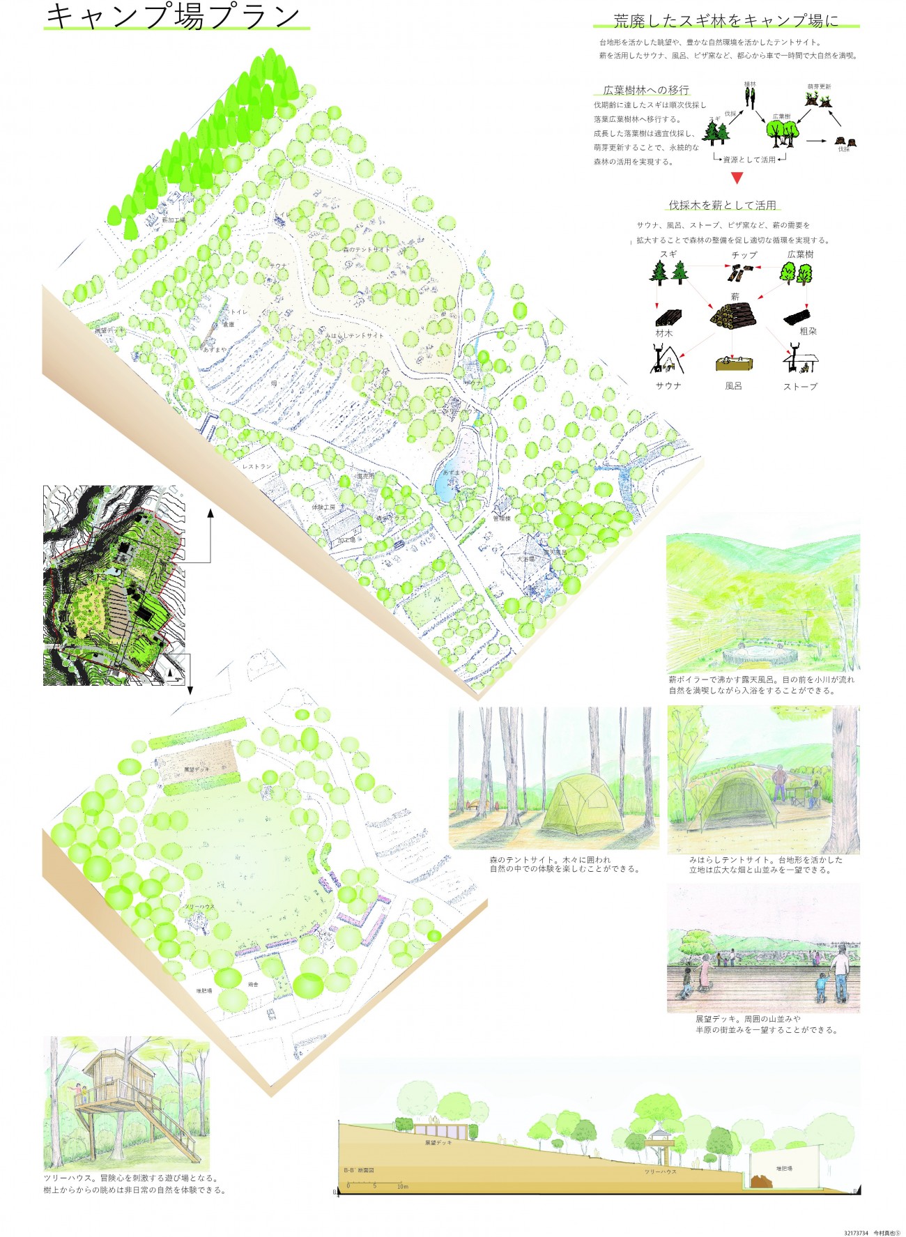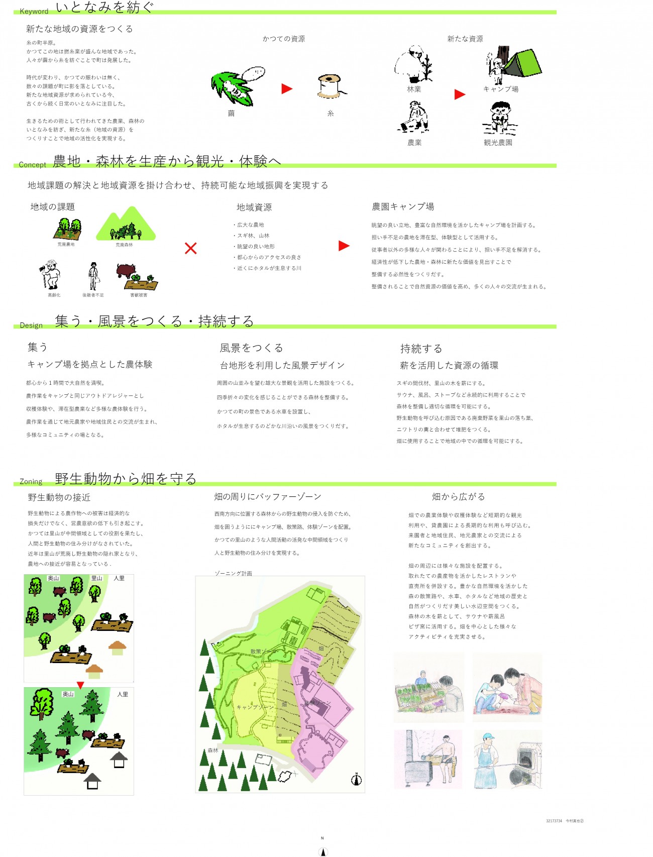 この地にキャンプと農体験をかけあわせたアウトドアを楽しむ空間をつくる計画をした。コンセプトは農地・森林を生産から観光・体験へということで担い手不足の農地は体験農園、荒廃森林はキャンプ場とし、地域課題の解決と資源を掛け合わせ持続可能な地域振興を目指す。農園では短期利用として、季節ごとの野菜や果樹の収穫体験、長期利用の貸農園は、キャンプ滞在で利用できる体制を整える。アウトドアを入り口に農に関心のある人を増やし、農業従事者以外の多様な人材による農地利用を実現する。荒廃したスギ林を活用したキャンプ場では台地形を活かした眺望、豊かな自然環境を活かしたテントサイト。薪を活用したサウナ、風呂、ピザ窯などを計画する。宮沢川の豊かな水の流れと共に育まれてきたホタル・ワサビ・水車という3つの資源を活用し地域の原風景となる水辺空間を創造する。