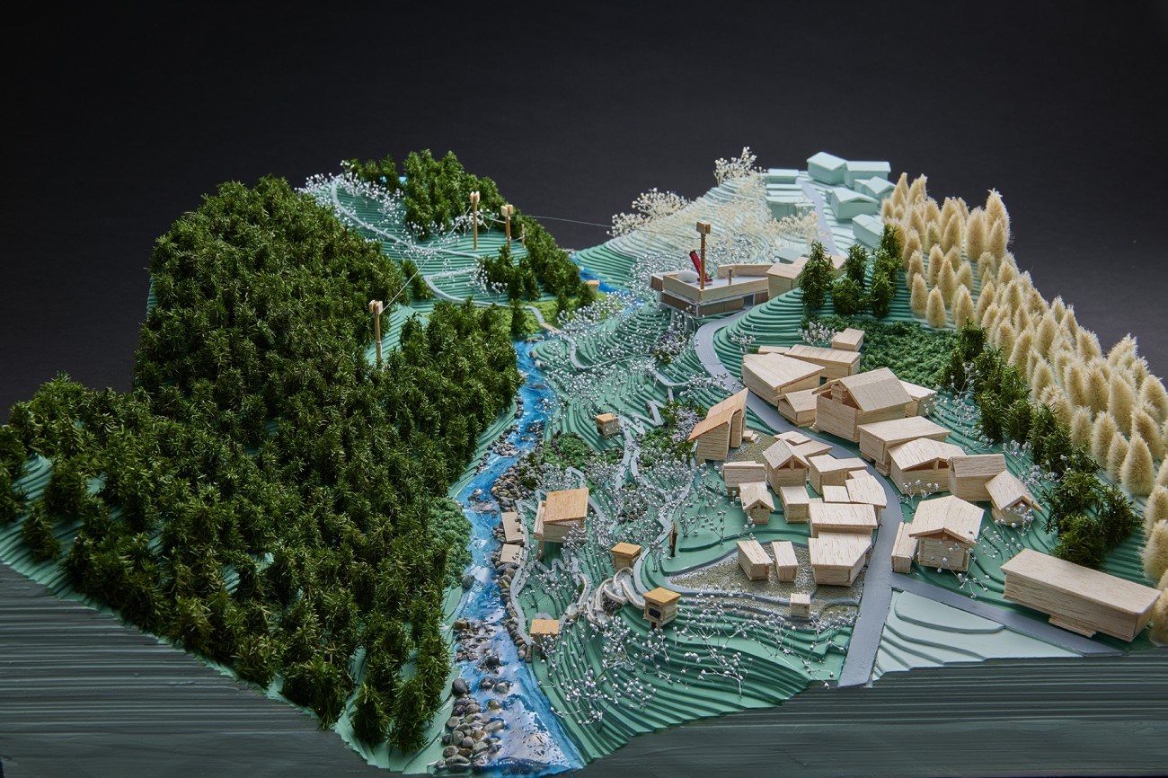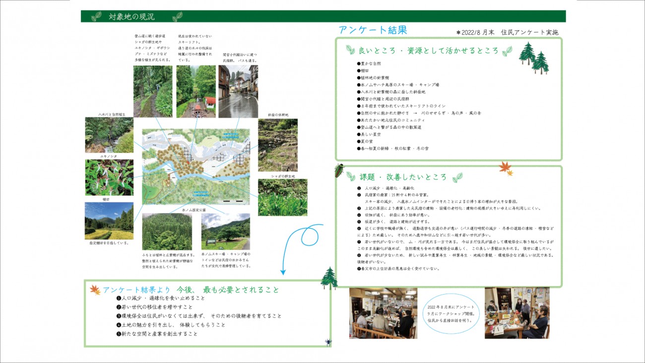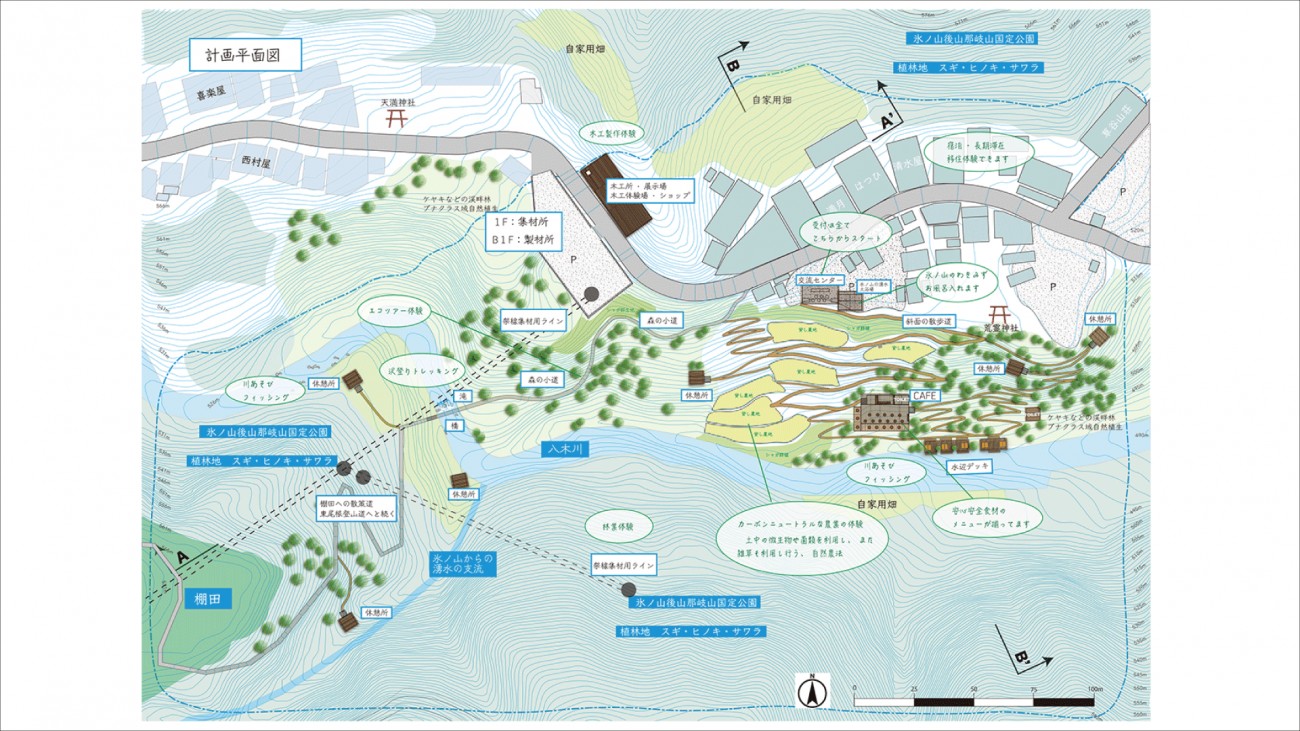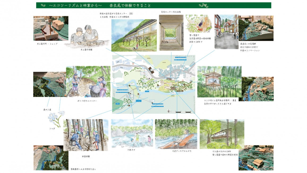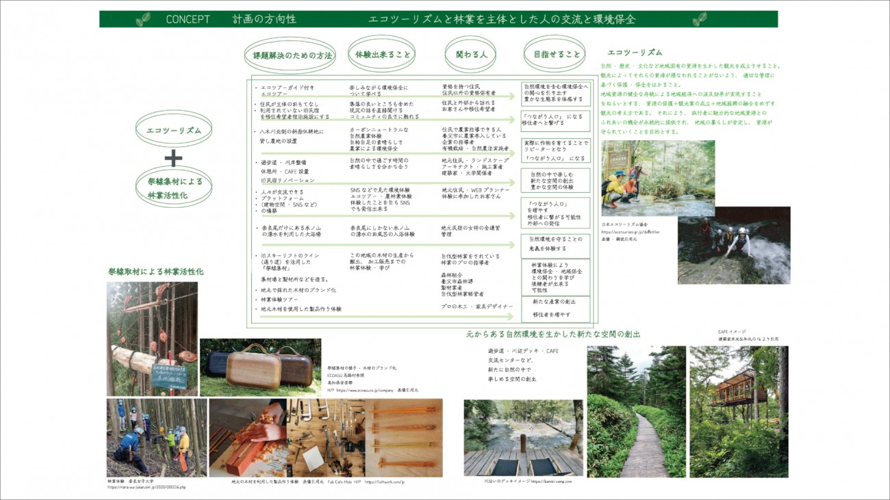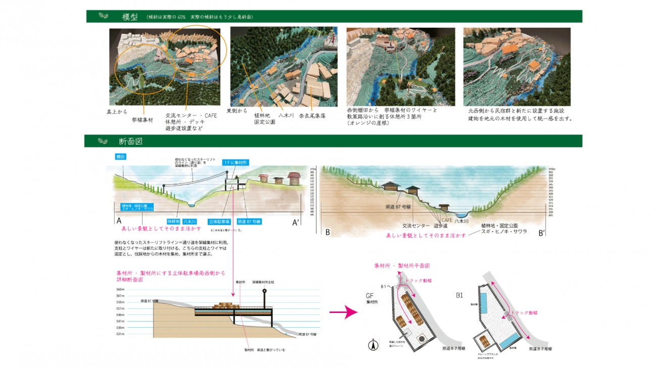 加工し、製作所で家具や木工製品を製作する。また、これらの体験を訪問者にもしてもらう。また、この木材をブランド化し、集落の生業として定着できるようにする。集落全体の建物はこの木材によるリノベーションを施し、木材の素晴らしさを宣伝しつつ、統一感を持たせた集落自体がランドマークとなる。そして、集落の川に面した斜面を利用し、自然を体験できる遊歩道や休憩所・CAFE・自然農法が学べる貸し農地・川辺での水辺体験・エコツアーガイドによるエコツアーなどを通して、この集落とその周りの自然環境の素晴らしさ、豊かさを体験してもらいながら、ゆくゆくは移住者になってもらい後継者となってもらえるように、住民主体でプロジェクトを進行できるように計画した。