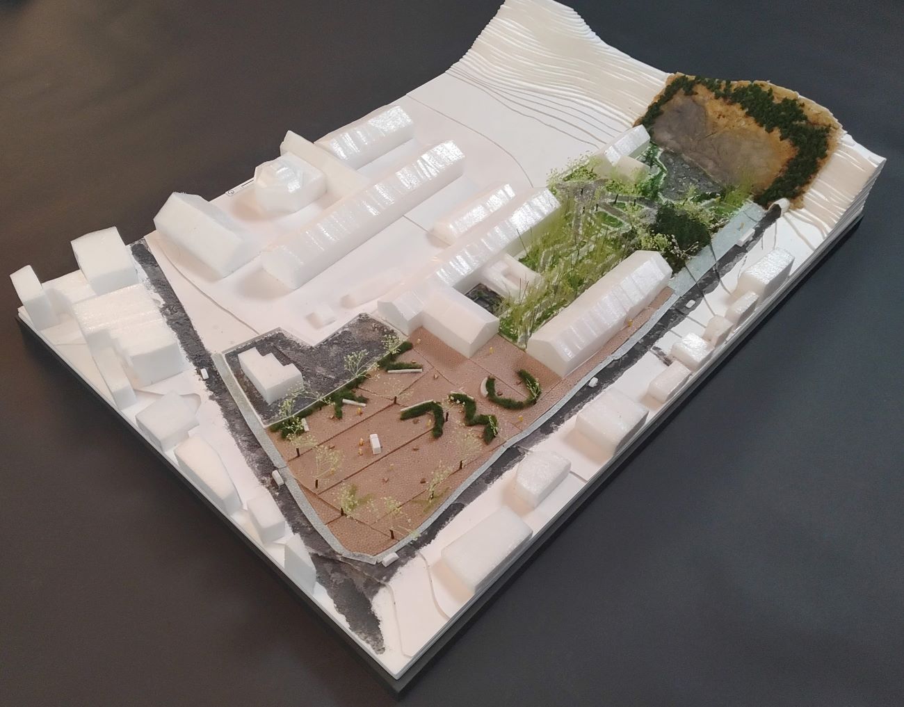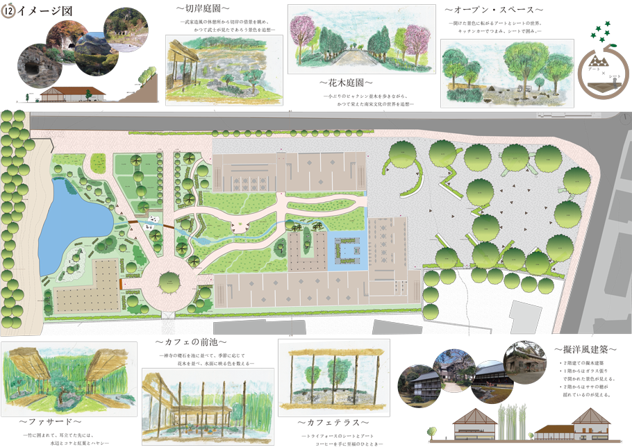 切岸のゾーンでは、切岸の岩肌の露出した斜面を借景にした池泉庭園となります。休憩所はなるべく武家造に近い形とし、鎌倉時代に武家が思いを馳せたであろう光景を楽しめます。