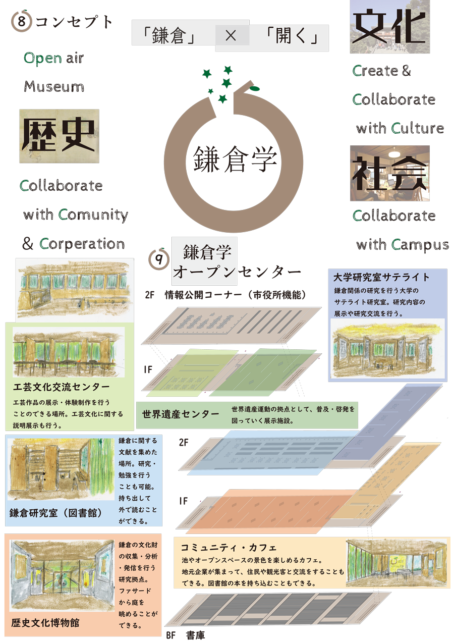 鎌倉の工芸作品を展示・体験制作できる場所、暫定リストに入っている鎌倉の世界遺産としての魅力を普及・啓発する場所、市役所派出所としての機能や情報公開機能を担う場所、定期的なイベントで地元企業等が住民や観光客と交流できる場所、鎌倉の文化財等の収集・分析・発信を行う場所、近隣大学のゼミのサテライトとして研究内容を展示する場所、鎌倉に関する文献を収集・整理する場所、これらを集め、鎌倉学を発信する拠点として機能することを想定しています。