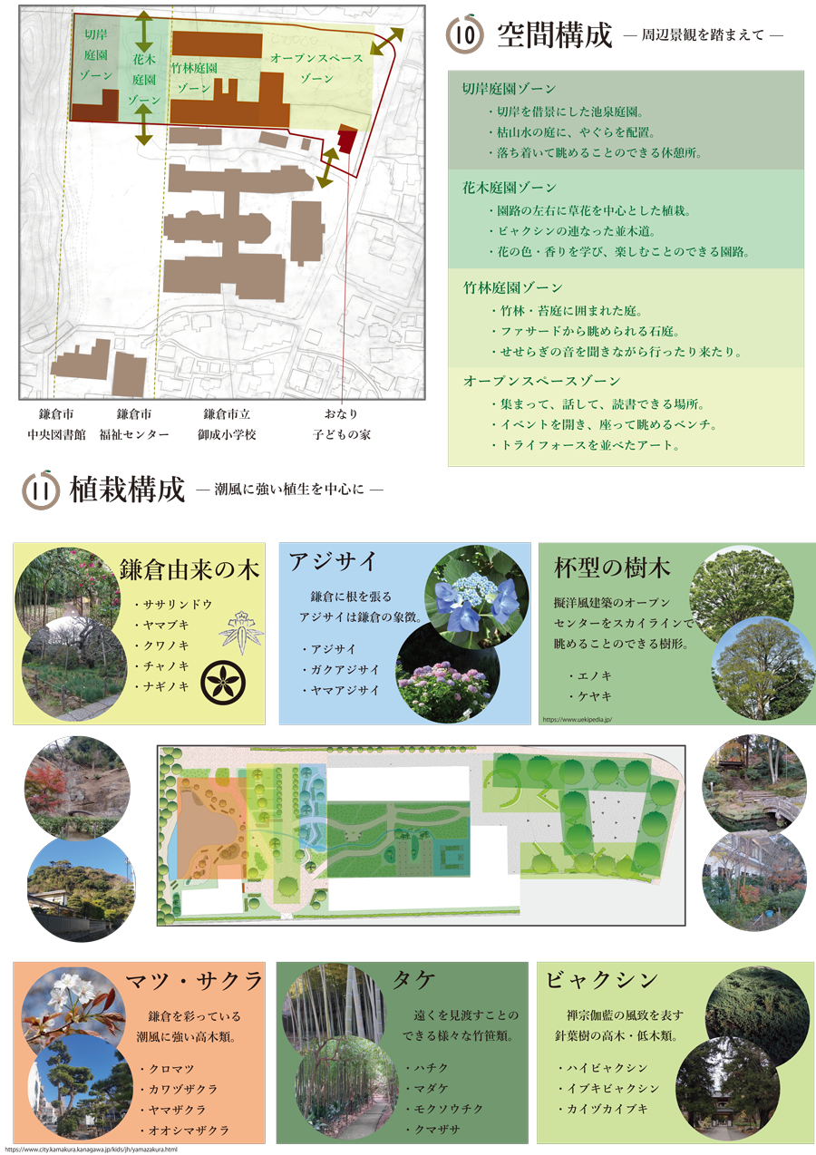 花木のゾーンでは、南側の御成小学校から北側へ抜けるビャクシン並木の一本道を中心に、先程あげた鎌倉の特性を生かした草木を植えています。草木には表示板を設け、鎌倉との繋がりを学べるようにしています。