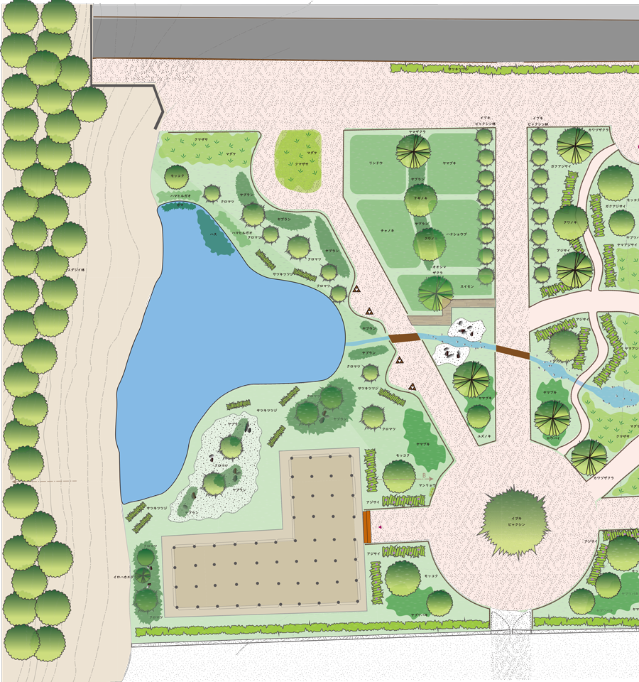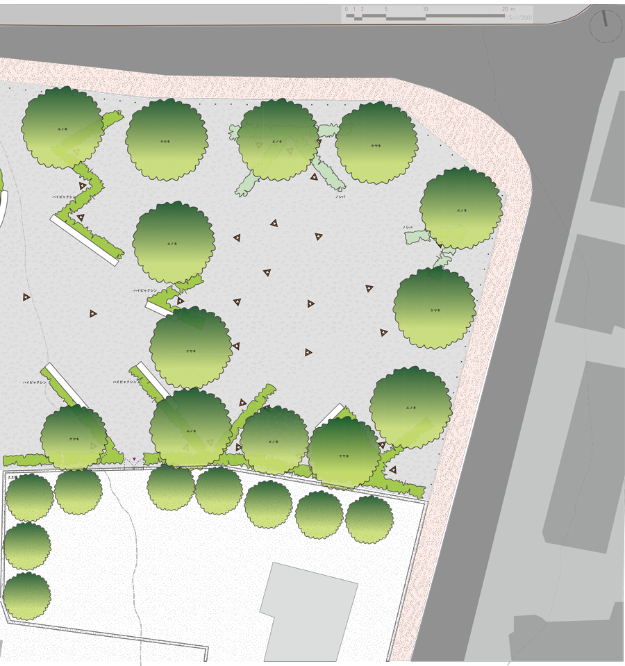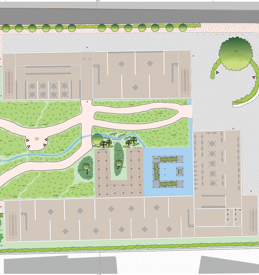 竹林のゾーンは、建物に囲まれて竹林の中で静かな時を過ごすことのできる場所です。従来あったビオトープの植栽をなるべく残し、ファサードから眺められるようにしています。