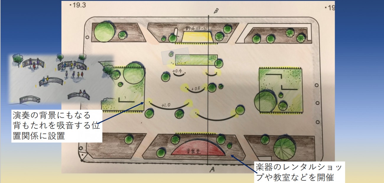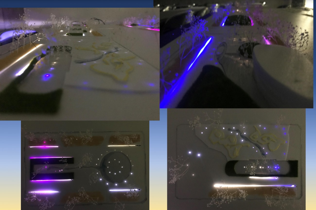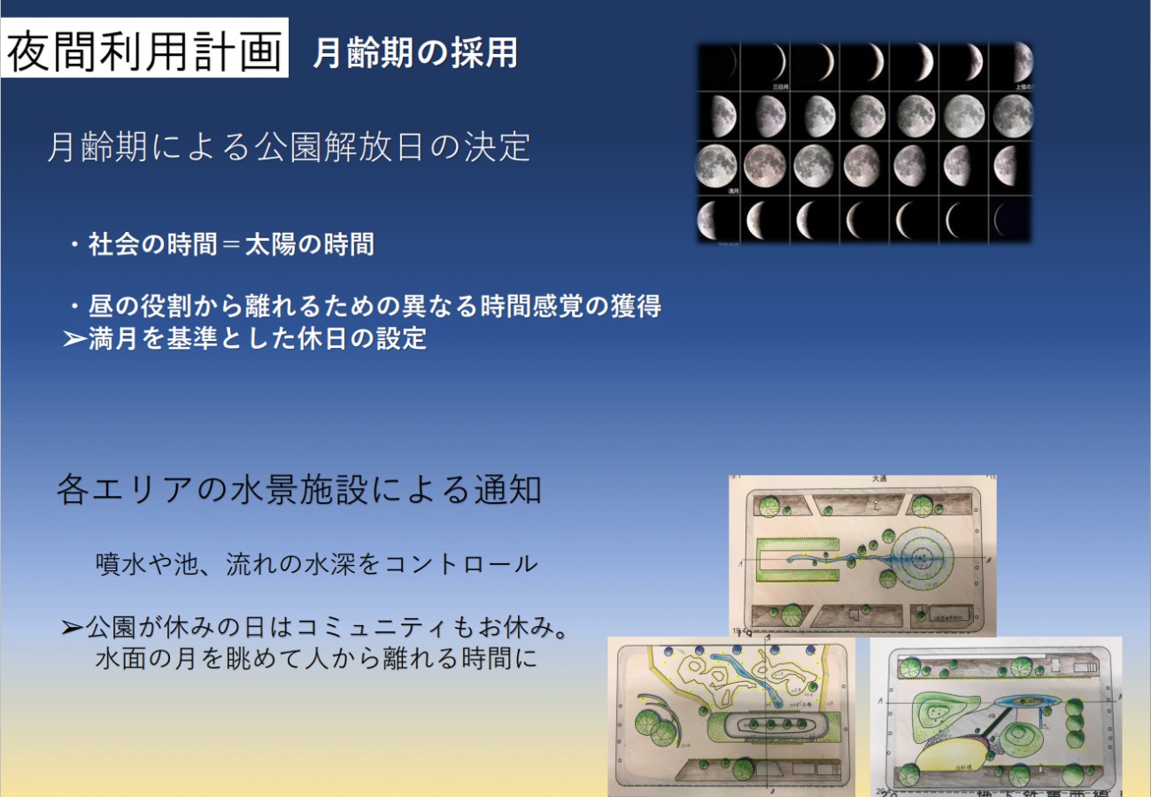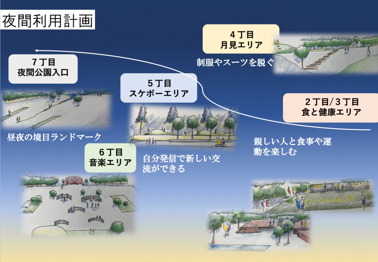 公園の夜間利用を月明りと人工照明をメインに、公園内各エリアの改修計画を考えました。