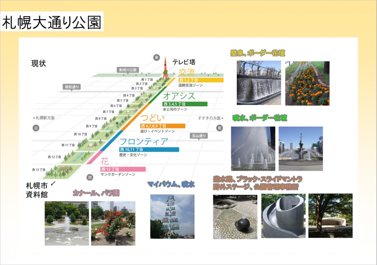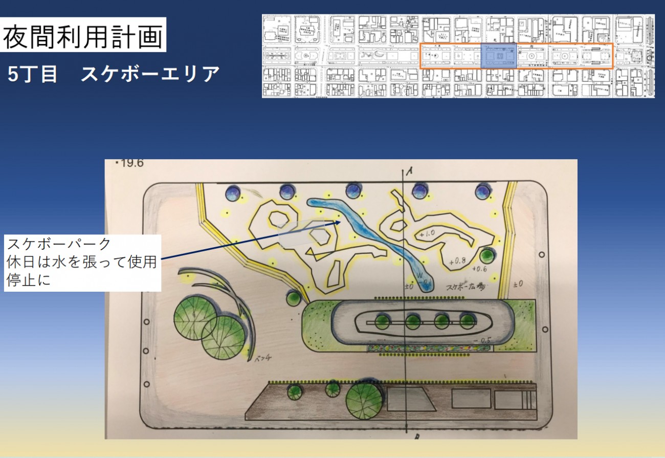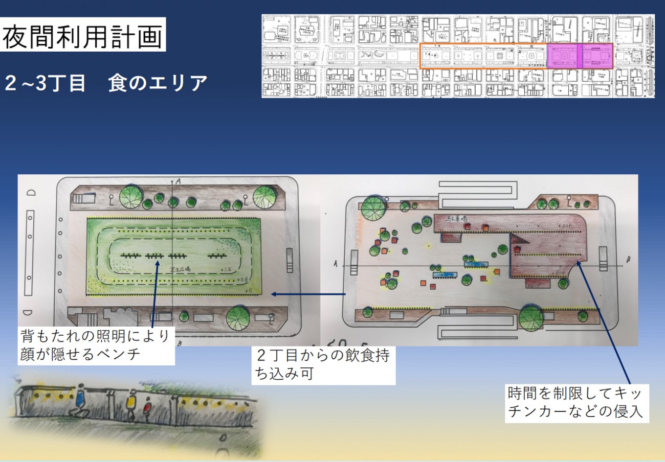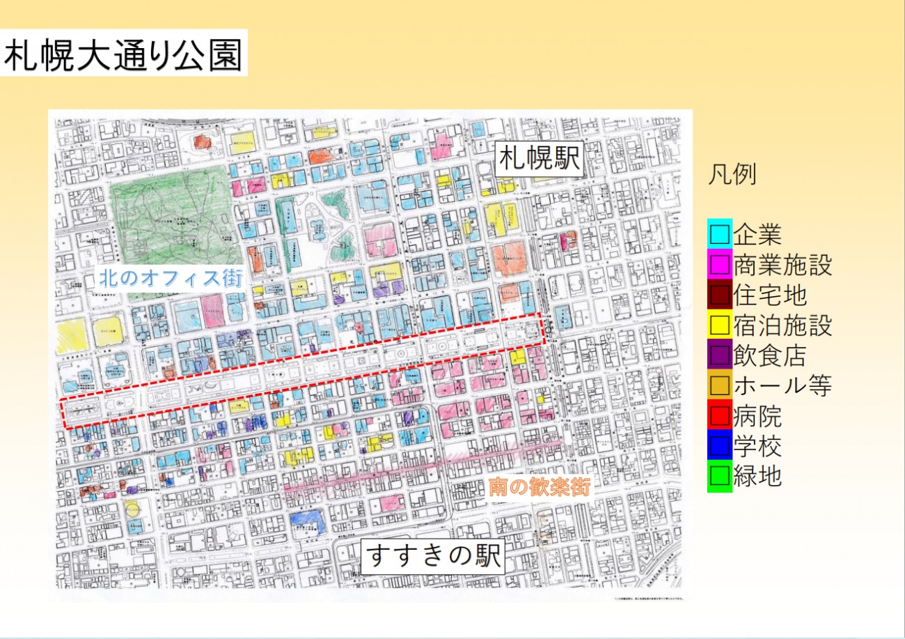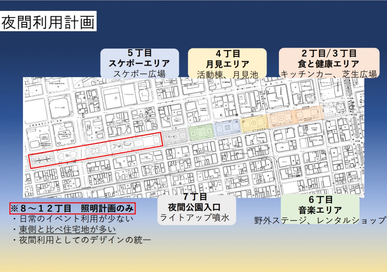夜間の利用には騒音や治安の悪化など周辺住民の理解を得る必要があり、夜間計画の成立は難しいのが現状です。しかし、今回対象地に選びました札幌大通り公園はオフィス街と歓楽街に挟まれており、夜間利用をすすめる上ではよい立地であると考えました。また、この公園は照明の数が少なく、夜間は真っ暗なため安全上の問題の解決にもなります。