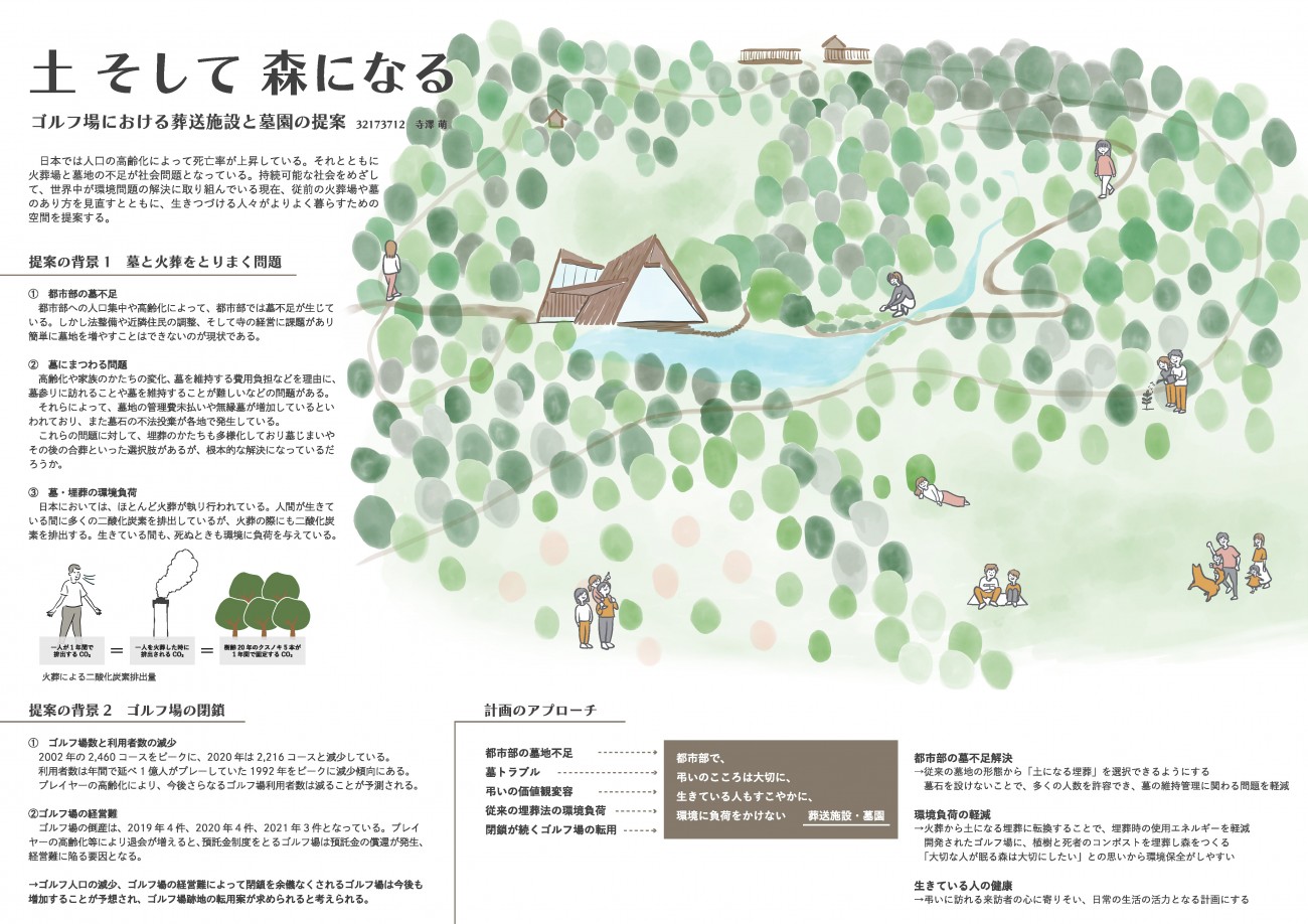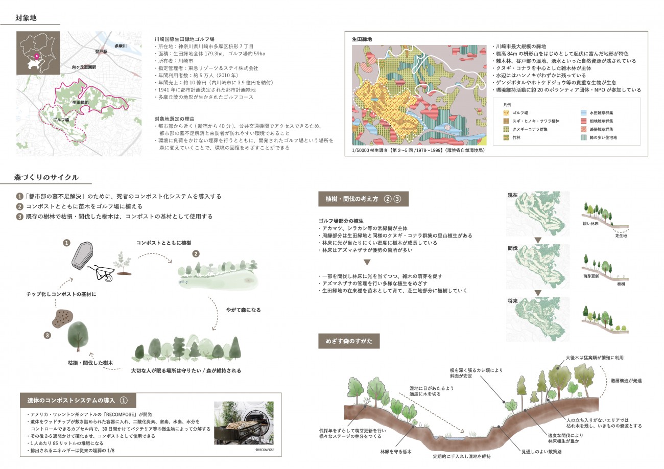 都市部における墓地不足、墓にまつわるトラブル、従来の火葬による環境負荷といった問題に対して、死者をコンポスト化する技術を用いてゴルフ場という開発された土地を森にしていく提案である。