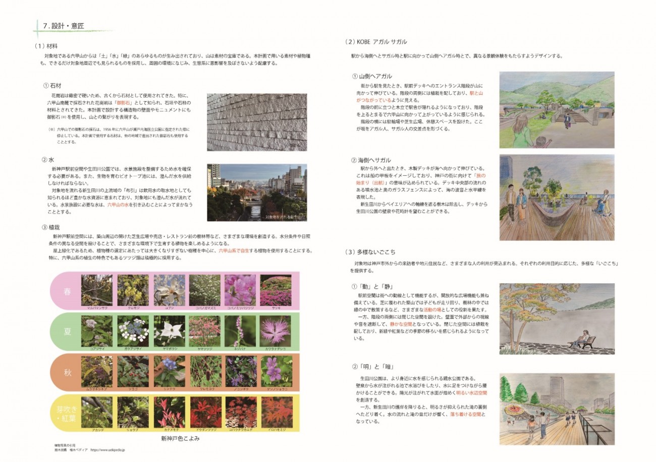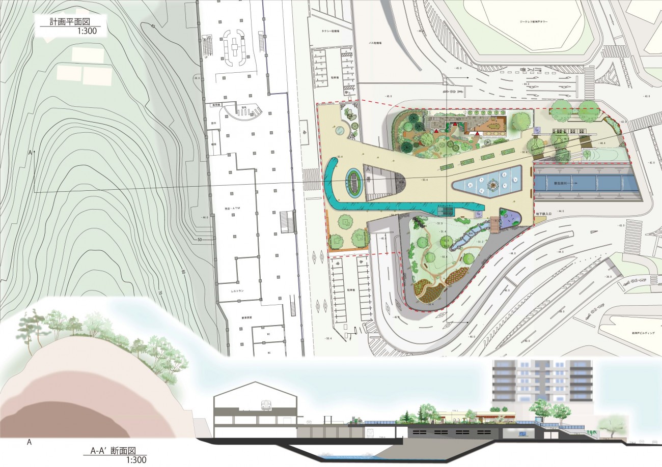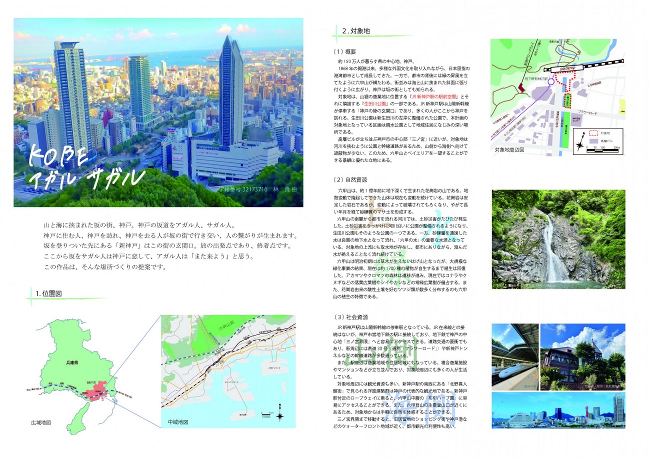 六甲山麓の新神戸からは海側への視界がよく効くビューポイントであるが、その魅力はほとんど知られておらず、新神戸を訪れた者は地下鉄への乗り換えのために、地下へとサガってしまう。本作品は、新神戸駅前と南側に隣接する生田川公園を再整備することによって人が集う駅前空間を創造し、坂をアガル人、サガル人が出会う場所にする提案である。
