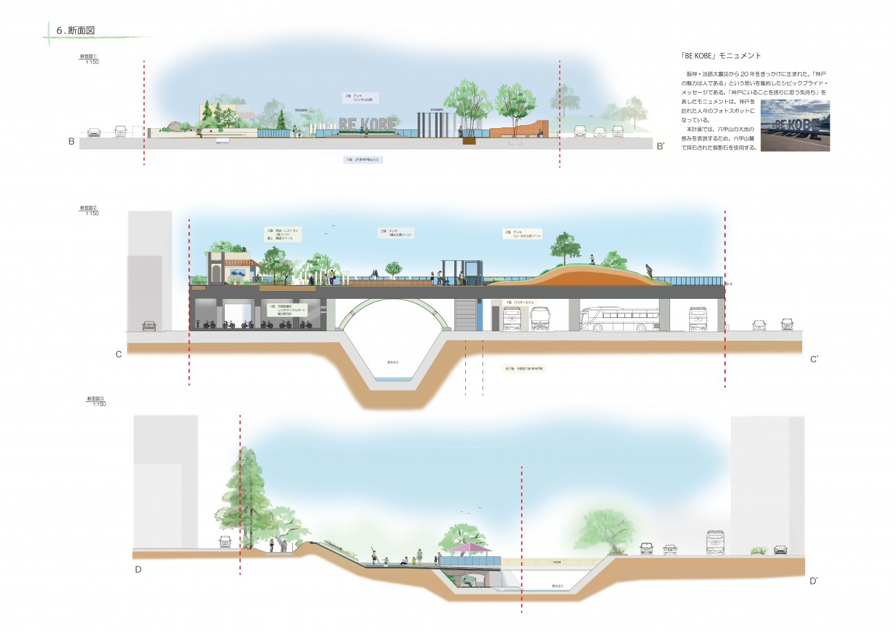 現在の地下への動線に加えて、「外」への動線を新たに設定する。駅から南側に新たにデッキ空間を造り、シンボル空間や緑地を整備することで、外に出たくなるような駅前を整備する。築山や噴水池、展望スペースからは、この場所の資源ともいえる「山」「海」「街」への展望を得られるよう多様な視点場を設けた。