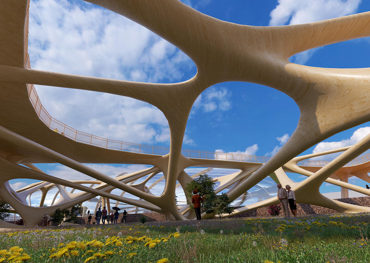 エリア1 緑の都市 植物細胞をモチーフにした木造の構造物