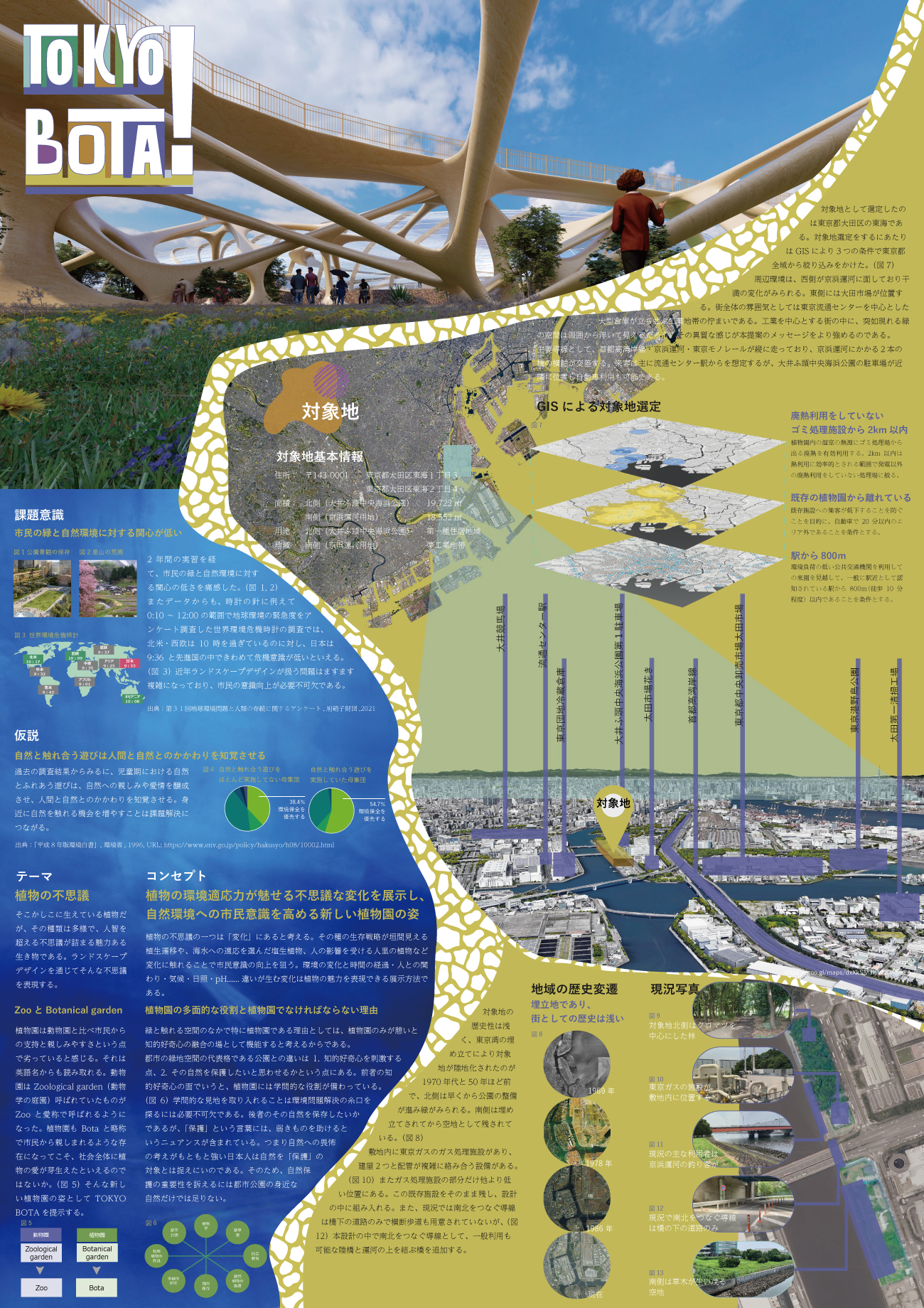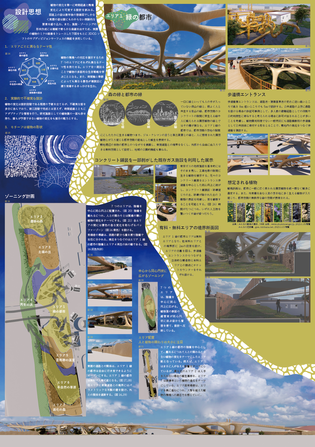 植物の不思議の一つは「変化」にあると考える。その種の生存戦略が垣間見える植生遷移や、海水への適応を選んだ塩生植物、人の影響を受ける人里の植物など「変化」に触れられる世界に類を見ない植物園の新しい姿を提案する
