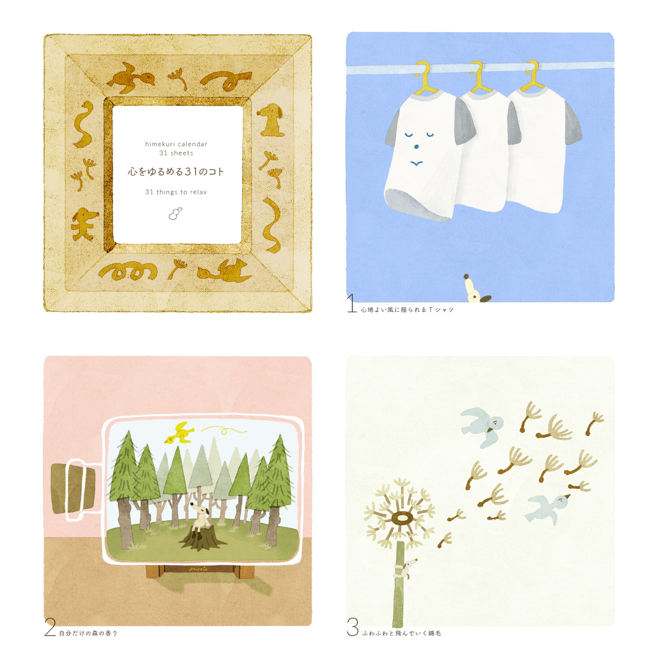 忙しい日々の中で、心をすこしでも休ませたい人へ、卓上で使える日めくりカレンダーを制作しました。匂いや音、手触りの質感を感じられる31枚のイラストを1日1枚めくることで、日々、心をゆるめるきっかけができるプロダクトです。