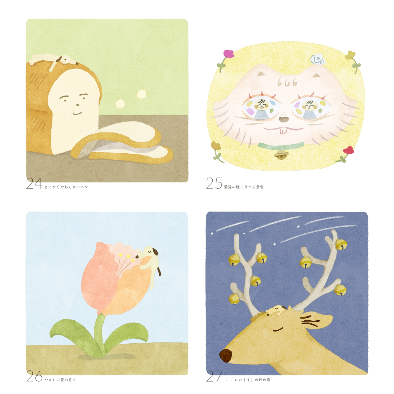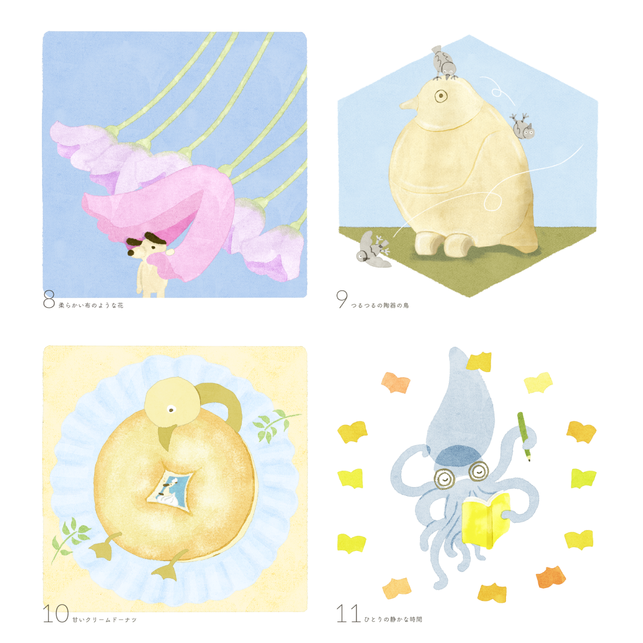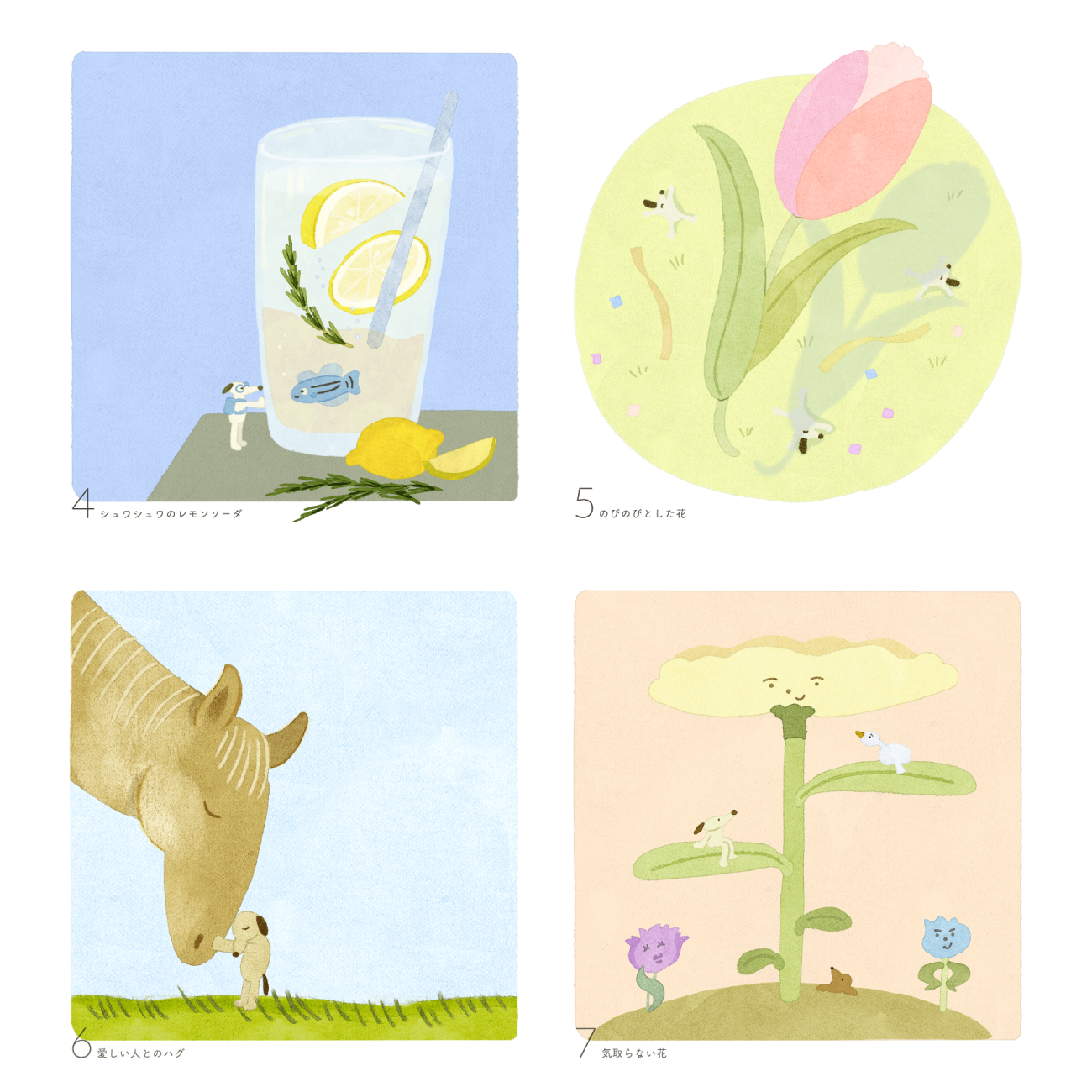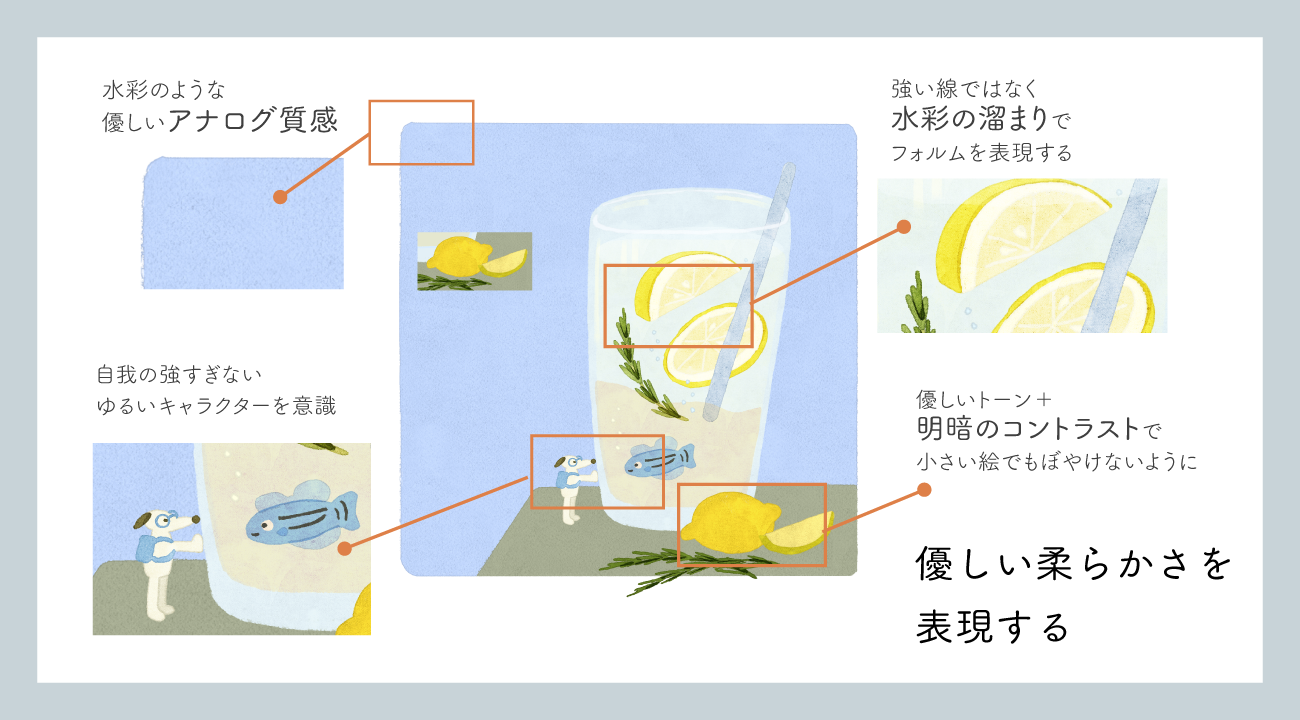 ひとつひとつのイラストは、優しい柔らかさが表現できるように、水彩のようなアナログ質感、強い線ではなく水彩の溜まりでフォルムをつくること、自我の強すぎないゆるいキャラクター、優しいトーンとコントラストのバランス、を特に意識して制作しました。