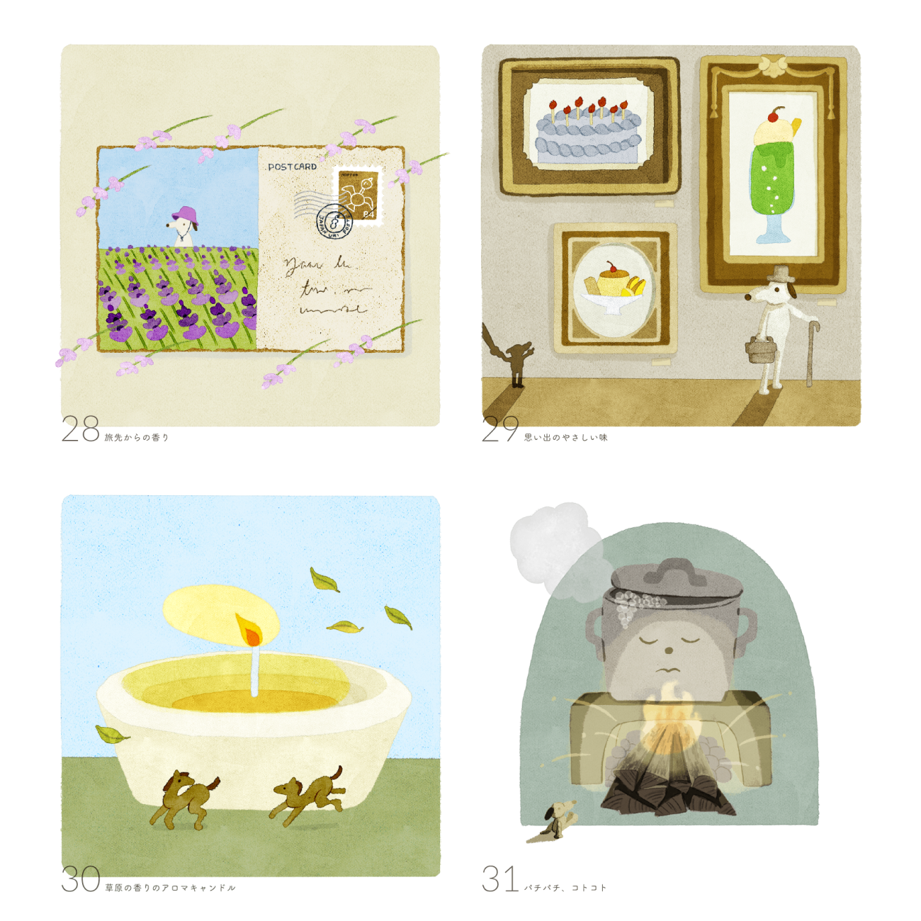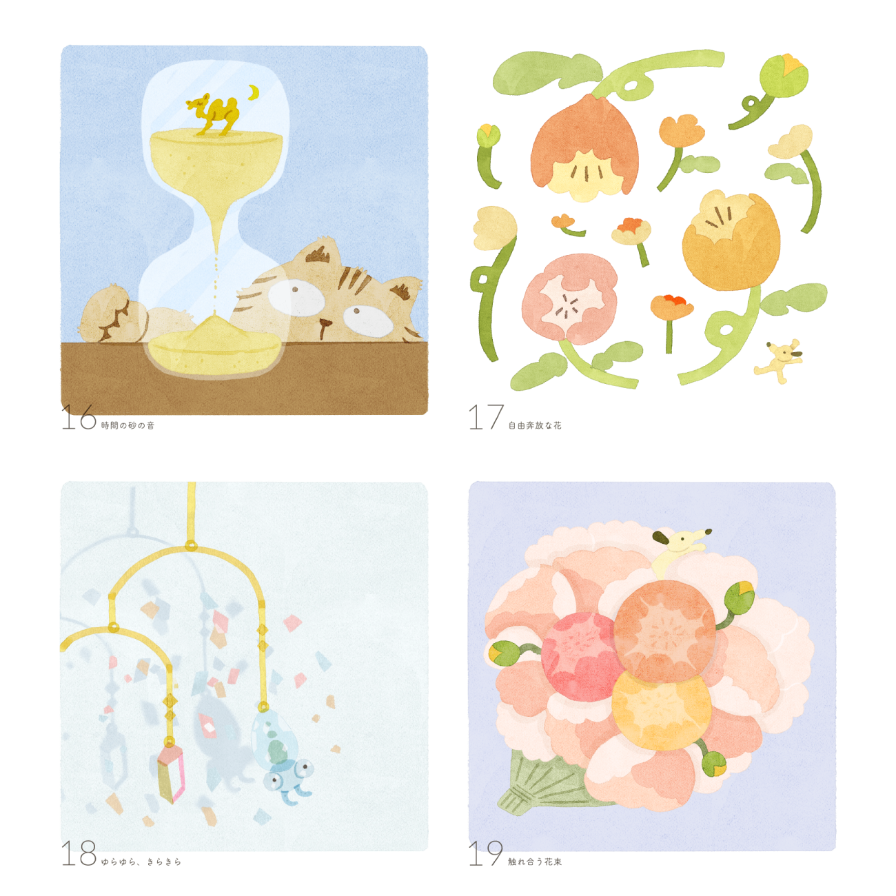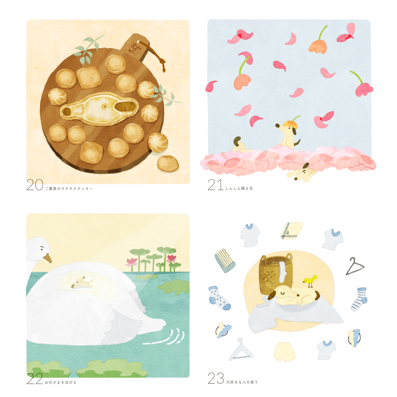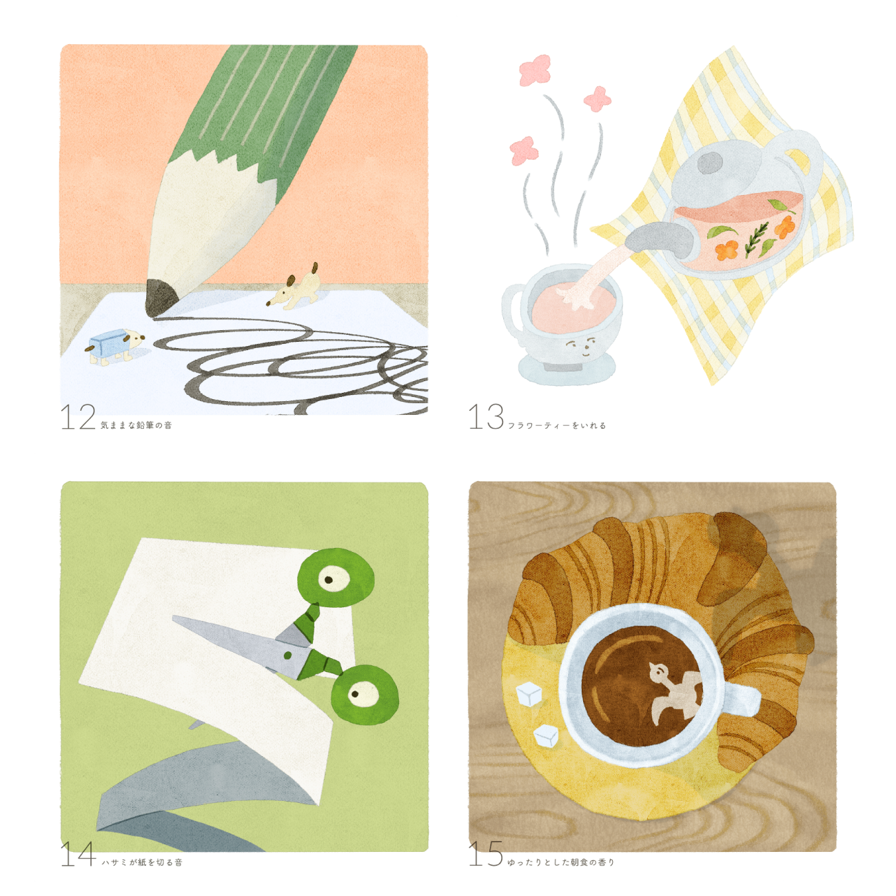 ひとつひとつのイラストは、優しい柔らかさが表現できるように、水彩のようなアナログ質感、強い線ではなく水彩の溜まりでフォルムをつくること、自我の強すぎないゆるいキャラクター、優しいトーンとコントラストのバランス、を特に意識して制作しました。